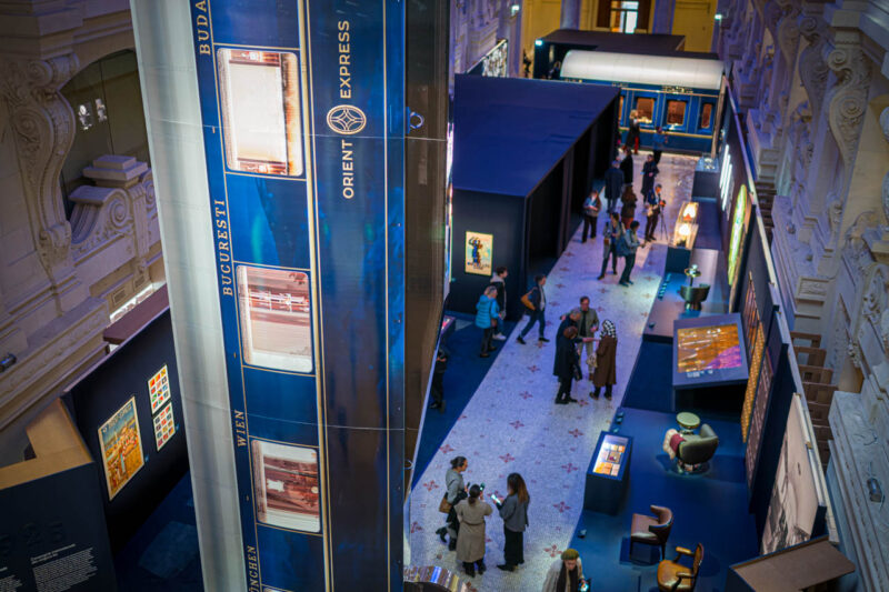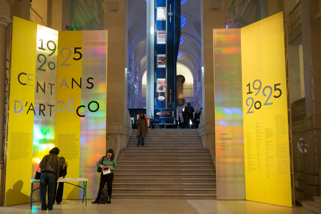パリ装飾美術館「アールデコ100年」展のエントランス。1925年から2025年へと時をまたぐように掲げられた鮮やかな黄色のパネルの奥には、オリエント急行の車体を象徴するブルーの構造体が縦に吊るされ、展覧会の中心テーマを遠くからでも印象づけている。光を反射する虹色のパネルが、20世紀初頭の革新と現代の洗練を静かに重ね合わせる。