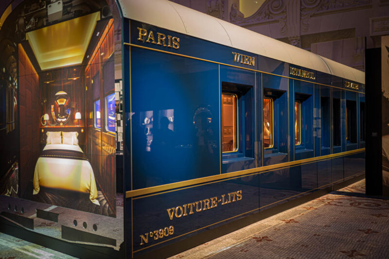 展示会場に一歩足を踏み入れると、まず出迎えるのは〈オリエント急行〉の世界。1920年代、ヨーロッパを東西に結んだこの列車は、単なる移動手段ではなく、まさに“動く宮殿”であった。車内を飾ったラリックのガラス装飾、ルールマンの家具、ポワレやランヴァンがデザインしたテキスタイル。すべてがアール・デコが象徴する「機能と装飾の融合」を体現している。今回の展示では、当時の豪華列車〈エトワール・デュ・ノール〉の客室を再現した実物大のキャビンとともに、建築家マキシム・ダンジャック(Maxime d’Angeac)が手がけた新生オリエント急行のモックアップが並置されている。そこには過去の栄光を懐かしむだけではない、未来に向けて“再構築されたアール・デコ”の姿があった。