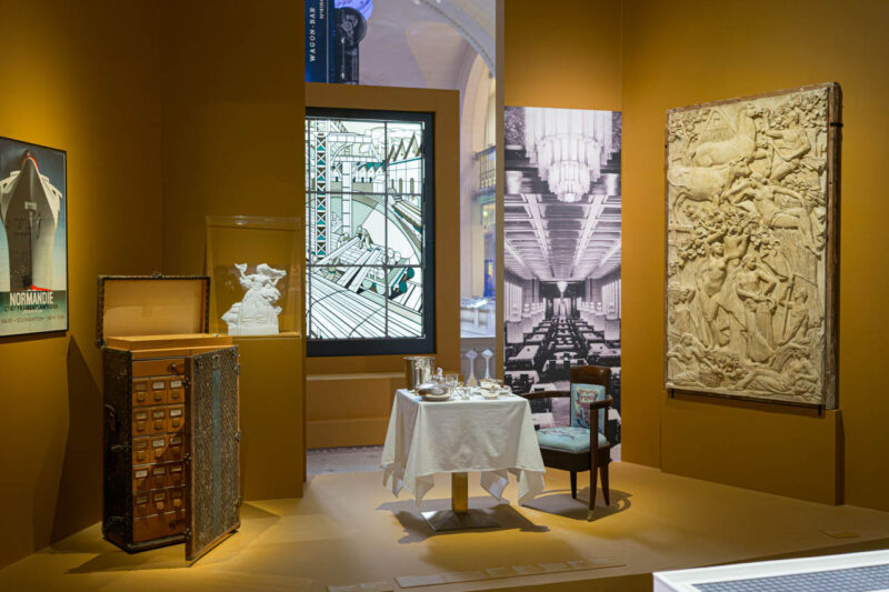 この展覧会の興味深い点は、オリエント急行を起点に、アール・デコがいかに“移動の美学”を育んできたかを辿る構成にある。鉄道から航空機、そして豪華客船へと至る流れは、20世紀初頭の人類が「速度と快適さ、そして美」を同時に求め始めた時代を象徴している。会場の後半では、ル・ブルジェの飛行機サロンを思わせる航空内装の模型や、ノルマンディー号に代表されるオーシャンライナーの船室デザインも紹介されている。いずれも、アール・デコがもたらした“未来への楽観”と“機械の美”を讃えるものであり、パリという都市がその中心であったことを改めて思い知らされる。