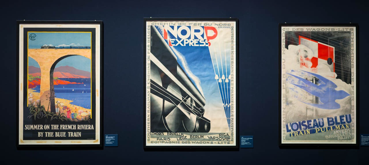 左はシャルル=ジャン・アロ(Alo)による〈Summer on the French Riviera by the Blue Train〉(1928)。地中海の陽光を平面的色面で切り取り、ブルー・トレインの避暑地イメージを軽やかに喚起する。中央と右はA.M.カッサンドル(1901–1968)。中央の〈Nord Express〉(1927)は、遠近法で切り込む車輪とレール、斜めに走る電線を幾何学化し、速度と近代を“図形”で可視化した代表作。右の〈L’Oiseau Bleu—Train Pullman〉(1929)は、CIWL(国際寝台車会社)の青い翼をモチーフに、旅そのものをアイコン化する。ロゴと文字を画面設計の一部へ統合する手法は、後年のオリジナル書体(Bifur ほか)や広告仕事へ連なるカッサンドルの本領で、アールデコ期のトラベル・ポスターを決定づけた。