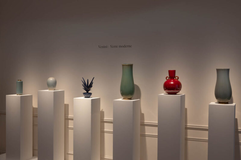 乳白がかったローズ、深いルージュ、琥珀のようなイエロー──釉薬の溶け込みがつくるグラデーションは、金属と木のストイックな面をやわらかく受けとめ、空間全体に静かなリズムを与えている。ここにも1925年博覧会以降のフランスが得意としてきた「色と素材による装飾」の系譜が見て取れる。