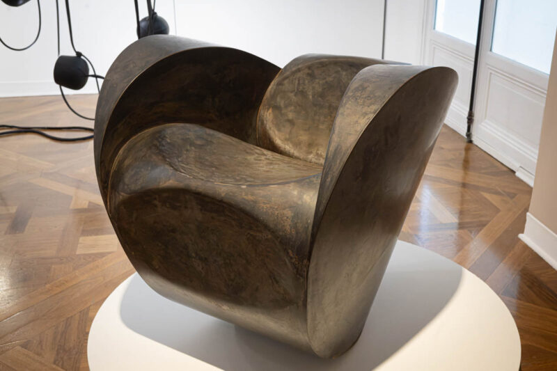 別室では、ロジャー・タロンのフロアランプ《Soleil Module 400》や、マリア・ペルゲイ《Vague》、ロン・アラッド《Rolling Volume》など、1960年代以降のデザインが並ぶ。タロンのランプはアルミニウムの球体と棒材だけで太陽系のようなフォルムを構成し、ペルゲイの波打つスチールの寝椅子は、ミニマリズムの冷ややかさと身体性を同時に抱え込む。アラッドの椅子は、叩き出されたスチールの塊が、座るための器であると同時に純粋な曲面の彫刻として迫ってくる。