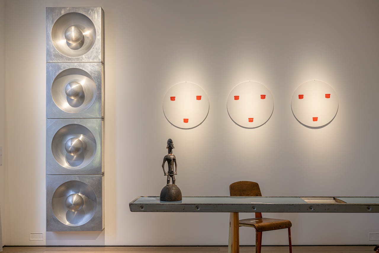ヴァーナー・パントンの《Spiegel》が放つ冷ややかなアルミニウムの光は、壁面に柔らかな円弧を描きながら空間を引き締め、ミニマルでありながら強い存在感を示す。一方、シャルロット・ペリアンが1952年に設計した《Console “Tunisie”》は、折り曲げたスチールと木材が軽やかな水平線をつくり、機能性を底に据えた構造の誠実さを静かに伝えている。 この空間では、二人のデザイナーが異なるアプローチで追い求めた“光”と“構造”が自然に交わる。パントンの幾何学的な反射面は、ペリアンの素朴で人間的な素材のリズムを際立たせ、テーブル上のオブジェまでもひとつのコンポジションの一部に変えてしまう。冷たさと温度、工業性と手仕事という対照が、ここでは不思議な均衡を保ち、時間と文脈を超えたデザイン同士の静かな対話が生まれている。