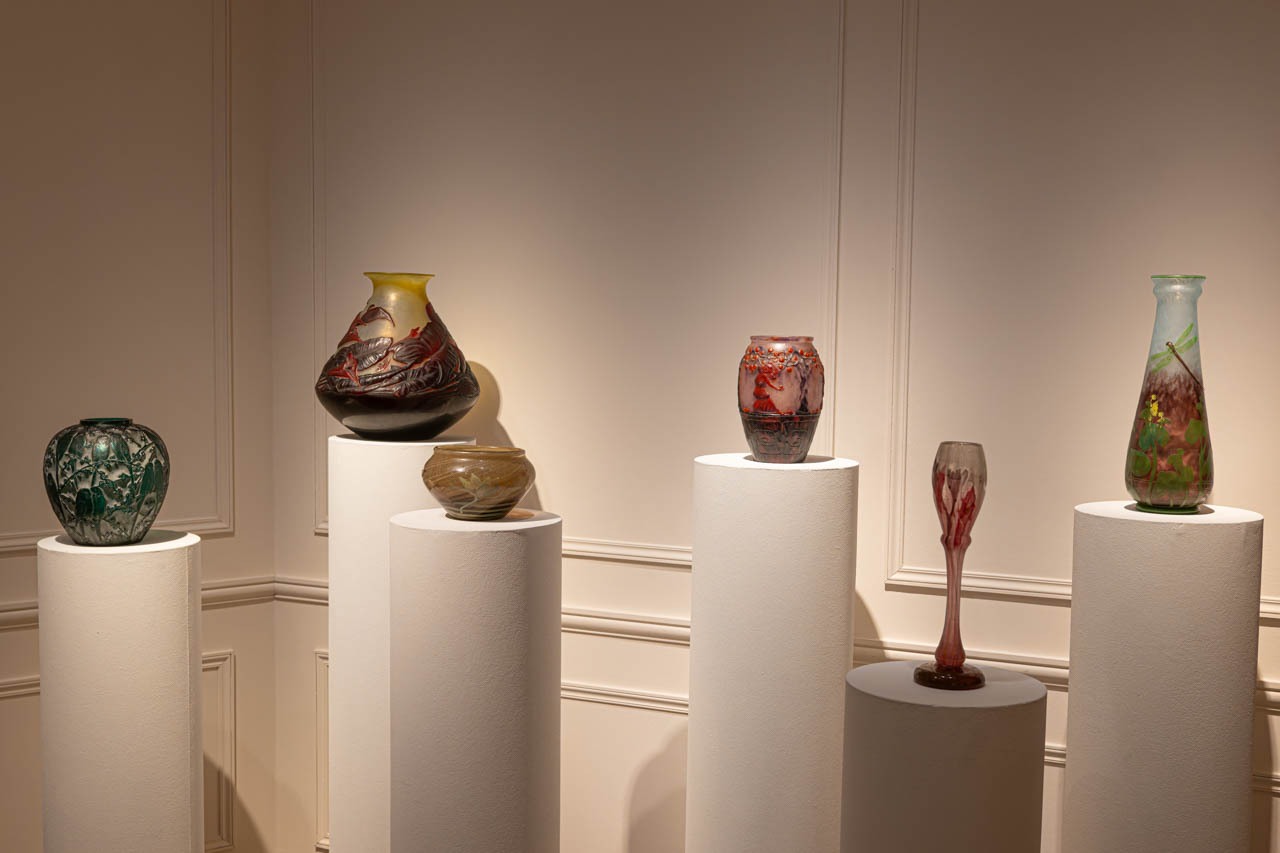 白い円柱台の上に並んだアール・ヌーヴォーのガラス器が、静かな照明に照らされて淡い光を返している。エミール・ガレが《Coupe “Nénuphars”》や《Vase parlant “Les Veilleuses”》で追求した有機的なマルケトリーと多層ガラスの深み、ガブリエル・アルジー=ルソーによる《Le Jardin des Hespérides》が放つパート・ド・ヴェール独特の柔らかな彩度、そしてDAUMの《Libellules et Renoncules》が示す酸化彫刻の繊細な陰影。それぞれの作家が、植物の気配や光の揺らぎを素材に封じ込めた技法の成熟が一望でき、19世紀末から1920年代にかけてのガラス芸術がどれほど豊かな表情をもっていたかを、穏やかな緊張のうちに伝えている。