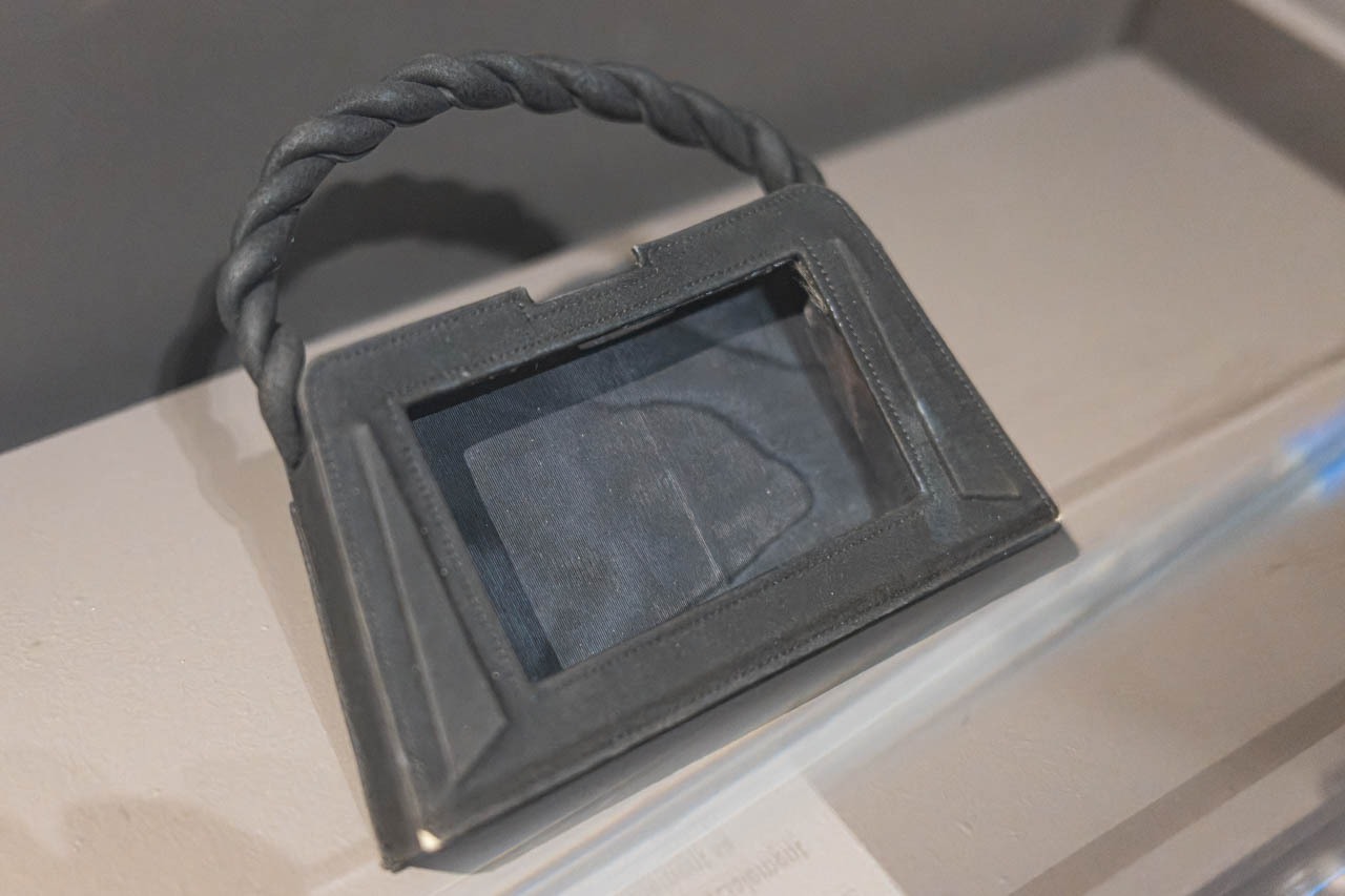 《ネセセール収納用バッグ》(メゾン・ブシュロン、1950年頃)。先に紹介した装飾ヴァニティ・ケースを収めるために特注されたレザー製のハンドバッグ。黒革による堅牢な外装とツイスト状のハンドルが特徴で、華やかな本体の装飾性を引き立てながら、安全かつ優雅に携行することを可能にしている。このような“オブジェ・ド・トワレット”は、戦後のハイソサエティにおいて女性たちの装いを完成させる必須のアイテムであり、ジュエリーの一種として高い芸術性とクラフツマンシップが求められた。ブシュロンはこうした装飾機能と実用機能を両立させたプロダクトを多く手がけ、1950年代のモードと宝飾の交差点を彩った。