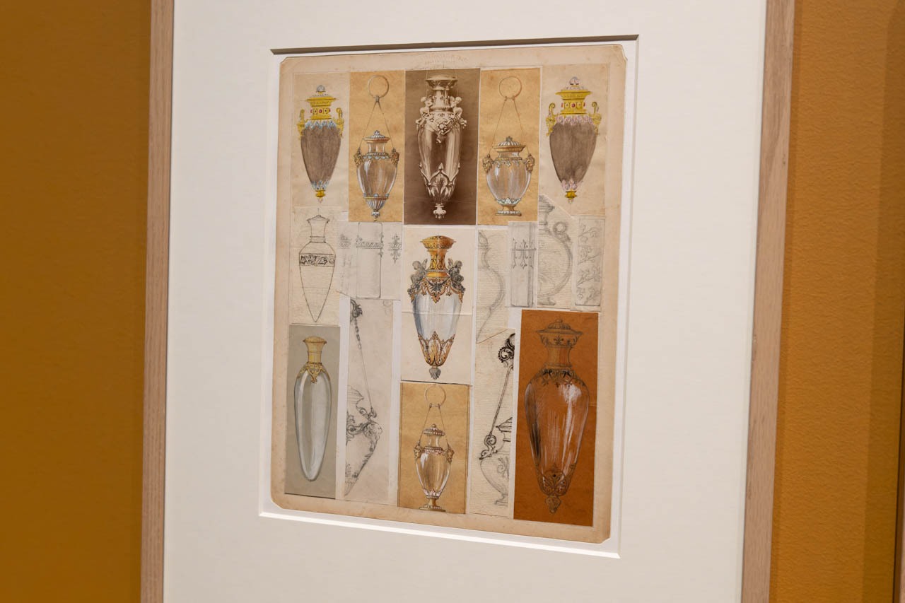 無名のデザイナーによって描かれたとされるこの《香塩瓶の図案集》は、19世紀から20世紀初頭にかけて活動していた金工芸の名門ファニエール兄弟工房の知られざる創作世界を物語る貴重な資料である。多層構造の紙面には、写真、ドローイング、彩色デッサンがコラージュのように組み合わされており、一つのデザインが構想から完成までどのように練られていったのかを一望できる。中央に配された写真図版に対応するように、その下には精緻なガッシュによる彩色画が配置され、選ばれる素材——例えば水晶の胴部に銀製の天使(プッティ)を施す意匠など——の再現が精密になされている。このような図面の構成力や質感の描き分けは、単なる装飾品という枠を超えて、工房の設計思想そのものを示すものであり、19世紀末の職人文化の深さを静かに伝えてくれる。