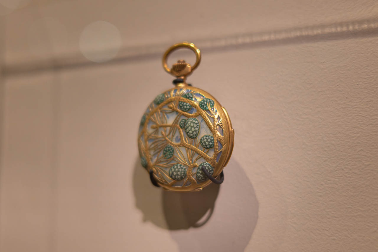 懐中時計裏蓋《松かさ》(ルネ・ラリック原案、ピエール=ジョルジュ・ドゥレズム彫金、1900年頃)。透かし彫りを施した金地に、松の枝と実が青緑色の七宝で繊細に描かれている。自然の生命力をたたえるアール・ヌーヴォー様式の典型的意匠であり、素材の豊かな質感とリズミカルな構成によって、装飾品としての完成度が高められている。本作は、彫金師ドゥレズムがラリックのデザインに基づいて製作したもので、当初の設計は写真の上にペンで加筆修正されるかたちで進められた。最終的な作品では、松かさをかたどった緑のエマイユがさらに追加され、全体に詩的な自然観を湛えている。宝飾芸術と彫金技術の理想的な協働を示す作例として、美術史的にも極めて貴重な作品である。