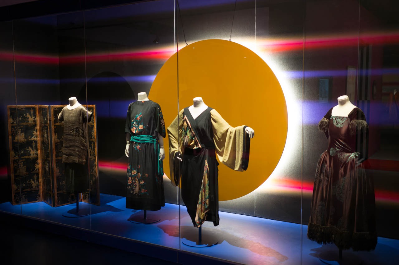 中央の黄色い円を背景に展示された黒地の着物風ドレスは、1922年にポール・ポワレが制作した《Robe, Martinique》。モロッコ風のクレープと中国風のプリント生地で仕立てられており、長い袖とゆったりとしたラインが特徴。アメリカ人芸術家ルイーズ・ジャニンが着用したことでも知られ、ポワレが自身のコレクションの中で繰り返し解釈した着物を象徴する作品。交差する打ち合わせと留め具のない構造が流れるようなシルエットを生み出している。