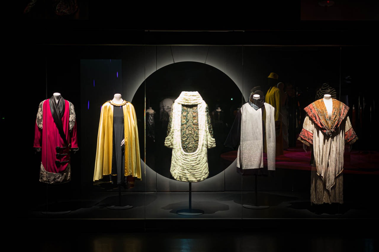 ポール・ポワレによる1914年から1929年にかけてのイブニングコートとケープを集めた展示。オスマン様式のシルクや刺繍を施したサテン、毛皮やラメ糸を用いた豪奢な素材使いが特徴で、エキゾチックな色彩や大胆なカッティングにより、当時の社交界に新風を吹き込んだ。中央の1926年頃のイブニングコートは豪華なファーと刺繍を組み合わせた逸品で、1929年頃のイブニングコートは歌手イヴェット・ギルベールが着用したと伝えられている。これらはポワレが自らのメゾンの庭園で催した舞踏会や、ベル・エポックのパリのカフェ・コンセールをテーマとしたショーのために制作されたものである。