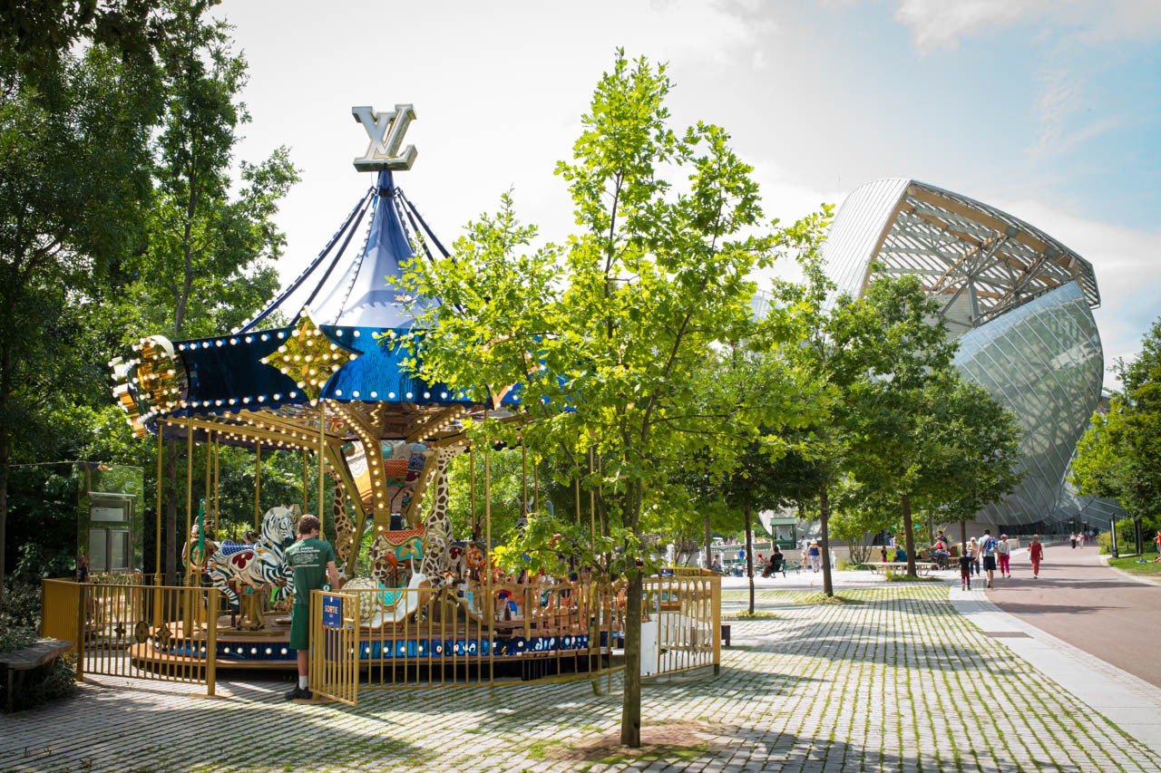 ジャルダン・ダクリマタシオン内に設置されたルイ・ヴィトン・カルーセルと、その背後にそびえるフォンダシオン ルイ・ヴィトンの建築を同時に望むことができる光景。ブランドの遊具と文化施設が一体となり、世代を超えて人々を惹きつける──これもまたルイ・ヴィトンが描くビジョンの一つである。