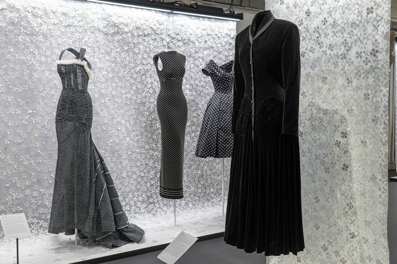 左手の3体は、半世紀を隔てて共鳴する「水玉(Pois)」の対話である。 中央奥のクリスチャン・ディオール(1954年秋冬 "PORTO RICO")が、硬質なシルクサテンにドットをプリントして構築的な「Hライン」を描いたのに対し、その左隣のアライア(2013年)は、同じモノクロームのドットをウールニットの中に編み込み、身体に吸い付く流動的なラインへと変換している。 特筆すべきは左端のアライア(2006年春夏オートクチュール)だ。このコットンボイルのドレスは、彼が2005年に入手した「クリスチャン・ディオールが1951年のベステギ舞踏会(Le Bal Beistegui)のために制作した羊飼いの衣装」から直接的なインスピレーションを得て生まれたものである。過去のアーカイブがいかにして現代のクチュールへと輪廻するかを示す、動かぬ証拠と言える。 右端に佇むのは、アライアによる1988年のベルベット・コートドレス。扱うのが極めて難しいシルクベルベットを用いながら、同色の刺繍で花柄を浮かび上がらせ、黒という色の中に無限の奥行きを作り出している。