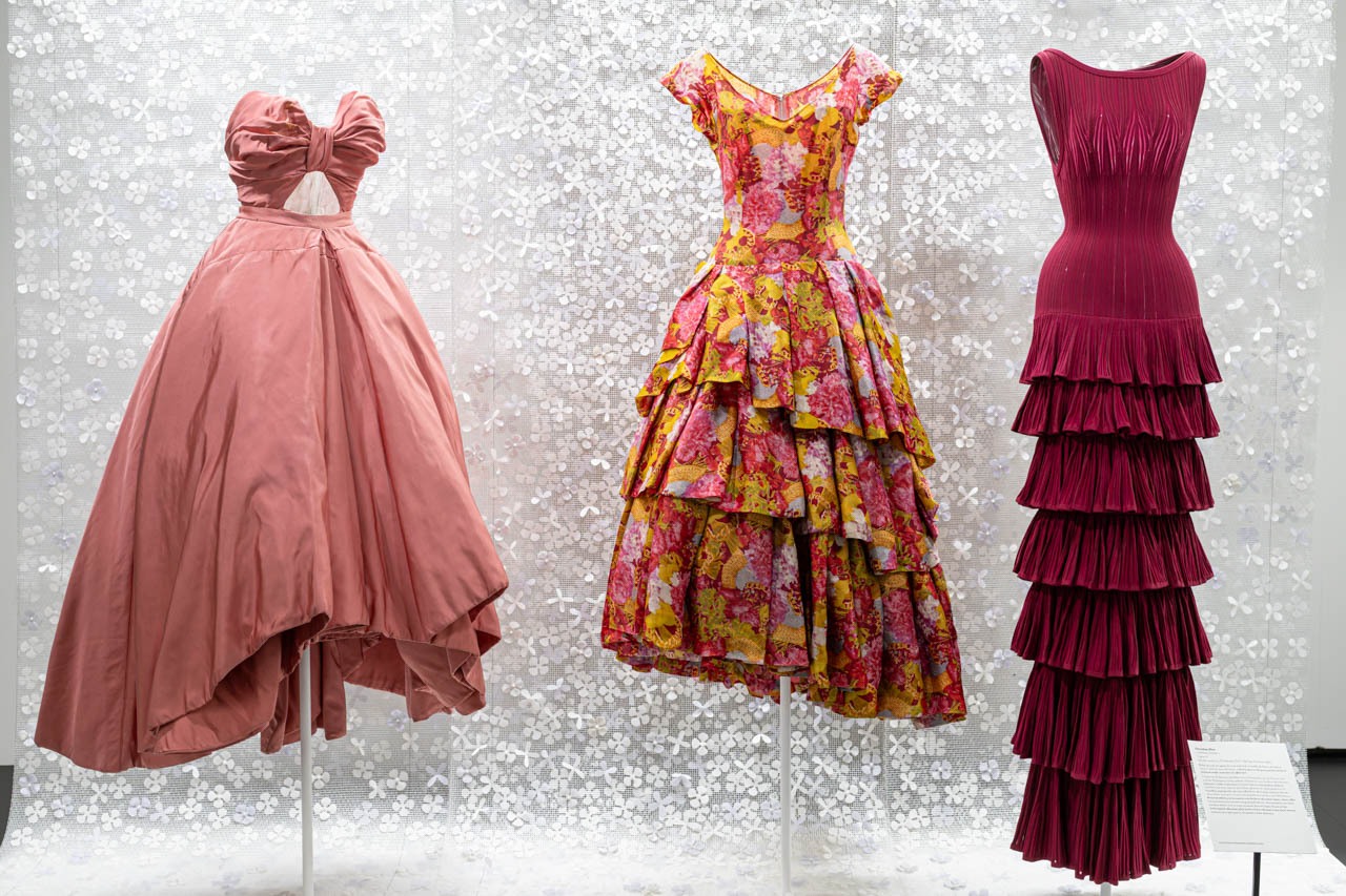鮮やかな色彩が並ぶこのセクションは、二人のクチュリエが共有した「スペイン」への憧憬と、舞踏のリズムによって貫かれている。 左端はクリスチャン・ディオール、1948年秋冬「SARABANDE(サラバンド)」。カーネーション・ピンクのシルク・ファイユを用いたこのドレスは、非対称のヘムライン(裾)が特徴で、バロック音楽の舞曲の名を冠するに相応しい躍動感を秘めている。 中央も同じくディオール、1955年春夏「ANDALOUSE(アンダルシア)」。花と宝石のモチーフがプリントされたシルク・ガザールが、不規則なラッフル(ひだ)となって踊る。スペイン南部の熱狂をパリのオートクチュールへと翻訳した一着である。 そして右端、アズディン・アライア(2013年春夏)が、その熱情を受け継ぐ。ラズベリー色のビスコース・ニットで仕立てられたロングドレスは、彼が1993年から追求してきた「ジプシー・ドレス」の系譜にある。足元で広がるティアード・スカートは、かつて彼がアルハンブラの庭園で過ごした夜の記憶と、スペインのシルエットへのオマージュである。