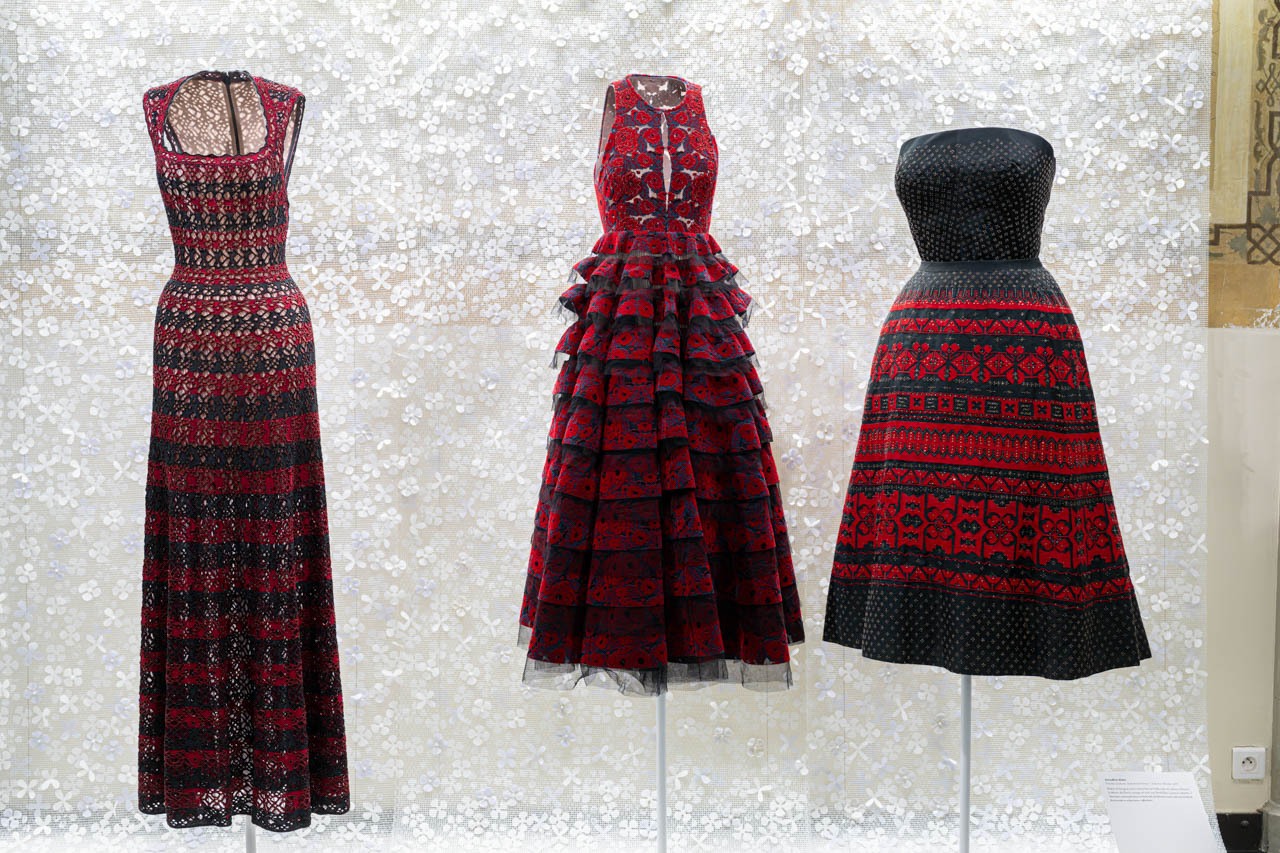 右端はクリスチャン・ディオール、1953年春夏「リーニュ・チューリップ(Ligne Tulipe)」より。黒のシルクサテンに、赤糸、金属糸、ガラスビーズを用いて幾何学模様が刺繍されている。光を吸い込むサテンの黒と、鋭く反射するビーズの赤の対比は、当時のカクテルドレスに求められたドラマ性を体現している。 対する左側の2着は、アライアの晩年である2017年秋冬コレクション。 左端のシース・ドレスは、黒とルビーレッドのボーダー柄だが、これはプリントではなく「レース効果を持つラメ入りニット(maille lamée effet dentelle)」で編み上げられたもの。ニットという素材でレースの繊細さと構築的な強さを同時に表現する、アライアの技術の到達点である。 中央のフリルドレスは、黒のチュールとフロッキー加工されたベルベットを用い、青い下地に赤と黒の花模様を浮かび上がらせている。