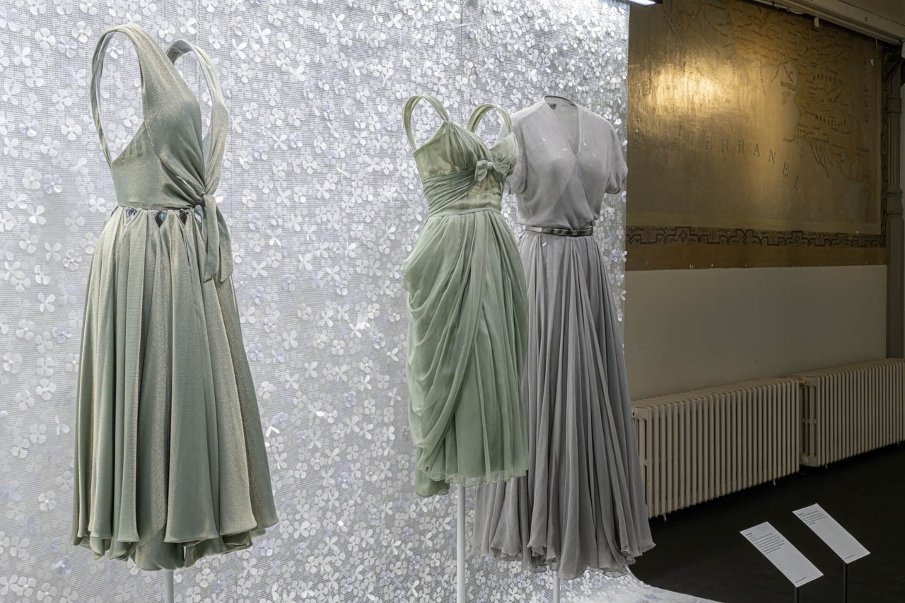 中央はクリスチャン・ディオール、1956年秋冬「MAXIM'S(マキシム)」。 「リーニュ・エマン(磁石ライン)」期のカクテルドレスで、海緑色(vert d'eau)のシルク・ムスリンが用いられている。バスト下の結び目から左右に広がるドレープは、重力を優雅に受け流すための計算された構造である。 その両脇を固めるのは、アズディン・アライアによる「軽さ」への解答だ。 左端(1989年秋冬)は、セラドン・グリーンのラメ入りニット。一見柔らかなドレープドレスに見えるが、ウエスト部分には「蝶番(ちょうつがい)」のような透かし細工(charnière ajourée)が施され、身体の動きを建築的に制御している。 右端(1990年春夏)は、グレーのシルク・オーガンザを用いたシャツドレス。ムスリンという浮遊感のある素材を、箱ヒダ(box pleats)によって地面へと引き寄せる、アライア特有の重厚なエレガンスが漂う。