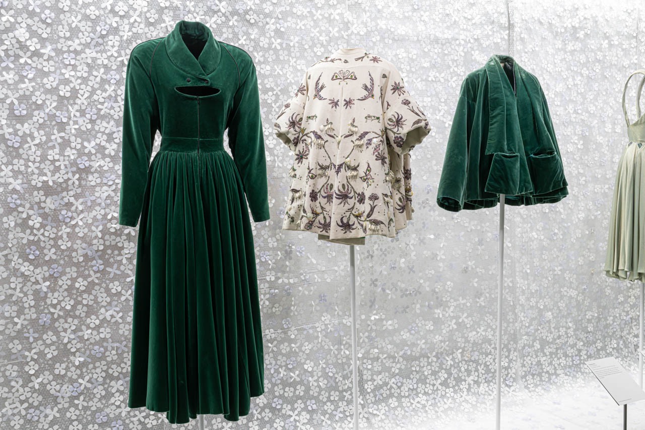 中央に鎮座するのは、クリスチャン・ディオール、1948年春夏「リーニュ・アンヴォル(Ligne Envol/飛翔ライン)」より、ディナージャケット「PONDICHÉRY(ポンディシェリ)」。 インドの旧フランス領の名を冠したこの作品は、グレージュ色のキャンバス地に、小枝、鳥、蝶のモチーフが極彩色の金属糸と緑のガラス玉(カボション)で刺繍されている。巨匠レベ(Rébé)によるこの刺繍は、戦後のパリからまだ見ぬ東洋への「想像上の旅」を表現している。 その異国への旅を挟むように配置されているのは、二人のクチュリエによる「緑のベルベット」の競演である。 右側のディオール(1949年秋冬 "PETITE ROUE")は、フォレスト・グリーンのシルクベルベットを用い、大きなショールカラーとポケットを一体化させることで、布の量感を優雅に見せている。 対する左側のアライア(1988年秋冬)は、同じ緑でもコットンベルベットを選び、バスト上部に楕円形のカットアウト(ouverture ovale)を施すことで、肌を覗かせつつ身体を厳格に包み込む、彼らしい官能的な構築美を完成させている。