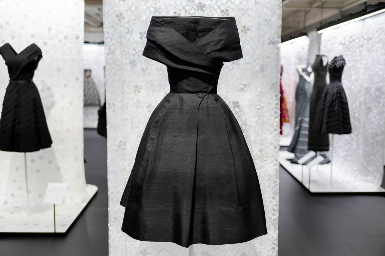 「リーニュ・リーブル(自由なライン)」期に発表されたアフタヌーンドレス。 素材には、特有の節(フシ)と張り感を持つ黒のシルク・シャンタンが選ばれている。 このドレスの主役は、肩を優雅に包み込むカシュクール風のドレープ襟(col drapé en cache-cœur)である。斜めに配されたボタン留めから、ふわりと広がるフレアスカートへの流れは、身体を締め付けずに美しい輪郭を描くという、晩年のディオールが到達した境地を示している。 1階の展示=「構造と対話の回廊」を静かに閉じる、完璧なプロポーションである。