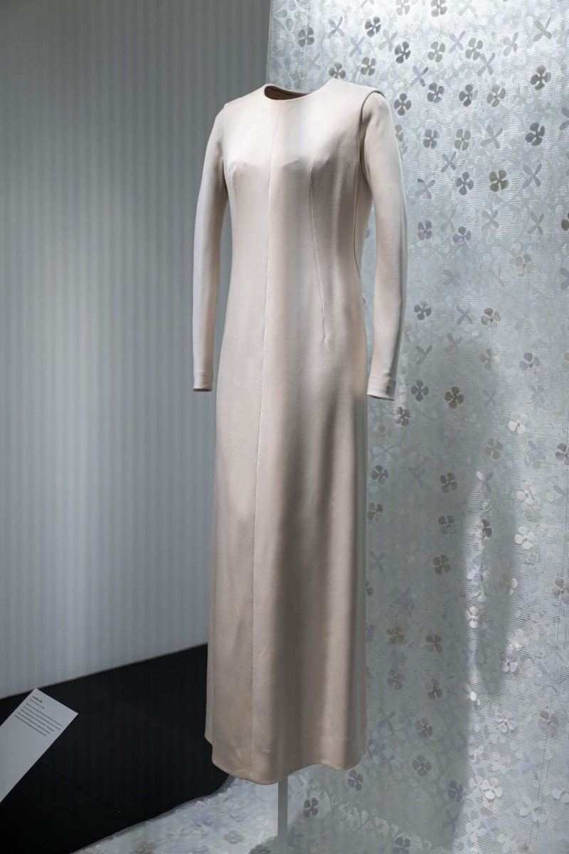 Azzedine Alaïa オートクチュール(1965年頃) 1980年代の世界的名声を得る遥か以前、1965年頃に制作された極めて稀少な初期作品。アイボリーのシルク・サテンを用いた一見すると修道女のように禁欲的なフロントとは対照的に、パネルの記述によれば、背面には首元から腰まで大胆なスリットが走っているという。その亀裂を繋ぎ止めるのは、ローウエストに通された一本のリボンのみ。若き日のアライアが、すでに「隠すこと」と「現すこと」の緊張関係を完全に掌握し、構造的な官能性を完成させていたことを物語る歴史的なアーカイブである。
