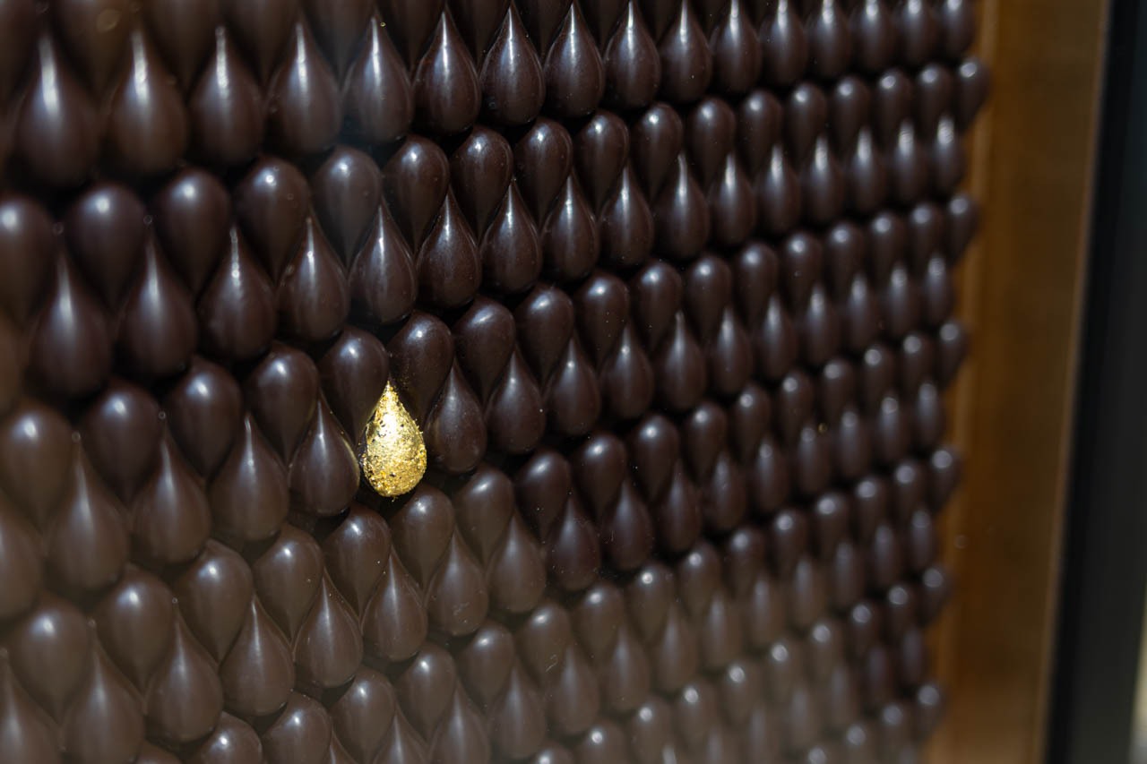 滴型ショコラの連なりが最もよく見えるディテールでは、ひと粒ごとの表面に宿る艶、境界の柔らかなカーブ、そして唯一差し込まれた金箔の“しずく”がリズムに揺らぎを与えている。均質性の中に微細な差異を忍ばせ、視線を奥へ誘う構成は、《Addiction》という名の通り、見続けたくなる“反復の美”そのもの。