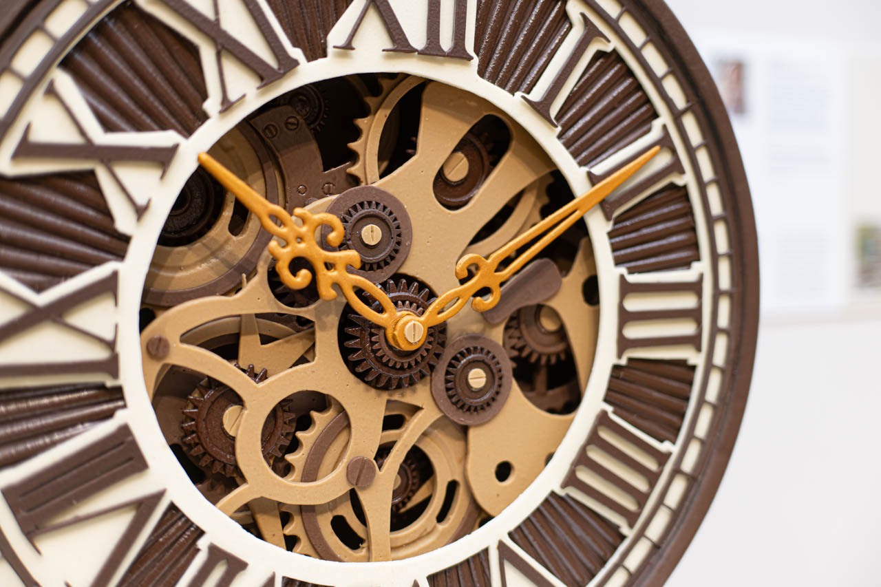 文字盤の奥に覗くギアやブリッジのひとつひとつは、ショコラで成形されながらも時計機構の精密さを思わせる仕上がり。焦茶・ミルク・ブロンドの色味を重ねることで素材の層が際立ち、黄金色の針が柔らかな光をすくい上げる。アンヌ・コルブルの“ショコラで時を刻む”という発想が、細部の造形にまで行き届いている。