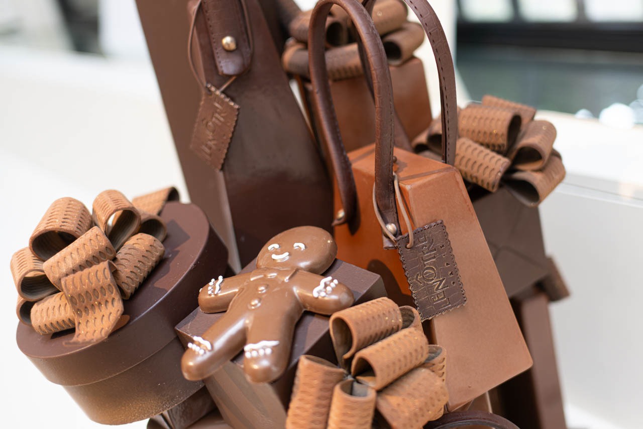 ショコラで成形された小さなバッグやリボン、ジンジャーブレッドが遊び心を添え、ホリデーシーズンの贈り物としての“物語”を一層豊かにしている。質感と陰影のコントラストが、作者の繊細な手仕事を際立たせる。