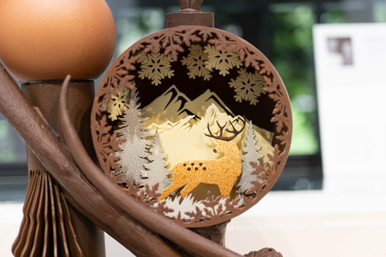 中央の球体を支える曲線のショコラは、枝のしなりや冬の森の気配を思わせる精緻な造形。奥には金の光を帯びた雪山と鹿が描かれ、まるで懐中時計の中に閉じ込められた冬景色のような世界が広がる。木肌のようなテクスチャーや松ぼっくりの立体感も丁寧に仕上げられており、デュシェーヌの優れた職人技と詩情が随所に息づいている。
