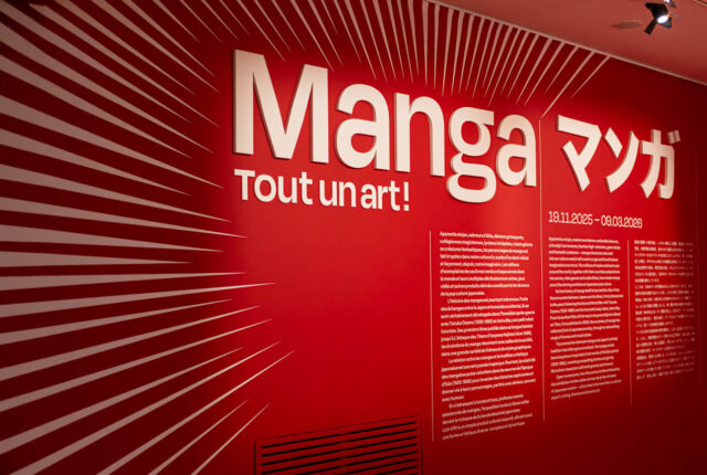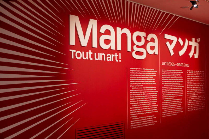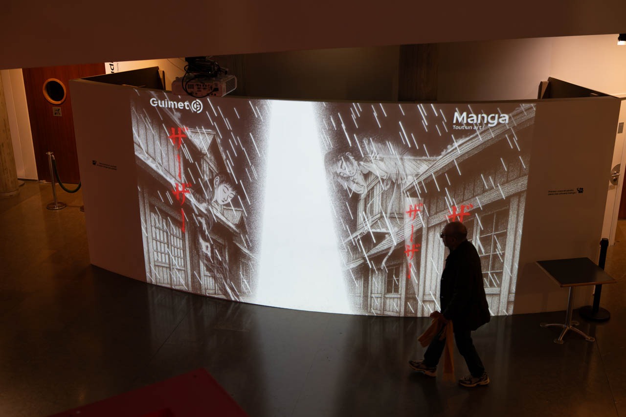 ギメ美術館で開催されている本展は、「マンガ」を現代のポップカルチャーとしてではなく、日本美術における長い視覚表現の系譜の中に位置づけることから始まる。入口に設えられた大型映像パネルは、線とコントラストを強調したモノクロームの画面によって、来場者をマンガの世界へと導く装置であると同時に、版画や素描といった“刷られるイメージ”の伝統を想起させる導入部となっている。ここで提示されるのは、マンガが読む物語である以前に、見る芸術であり、視覚的思考の結晶であるという本展の基本的な視点である。