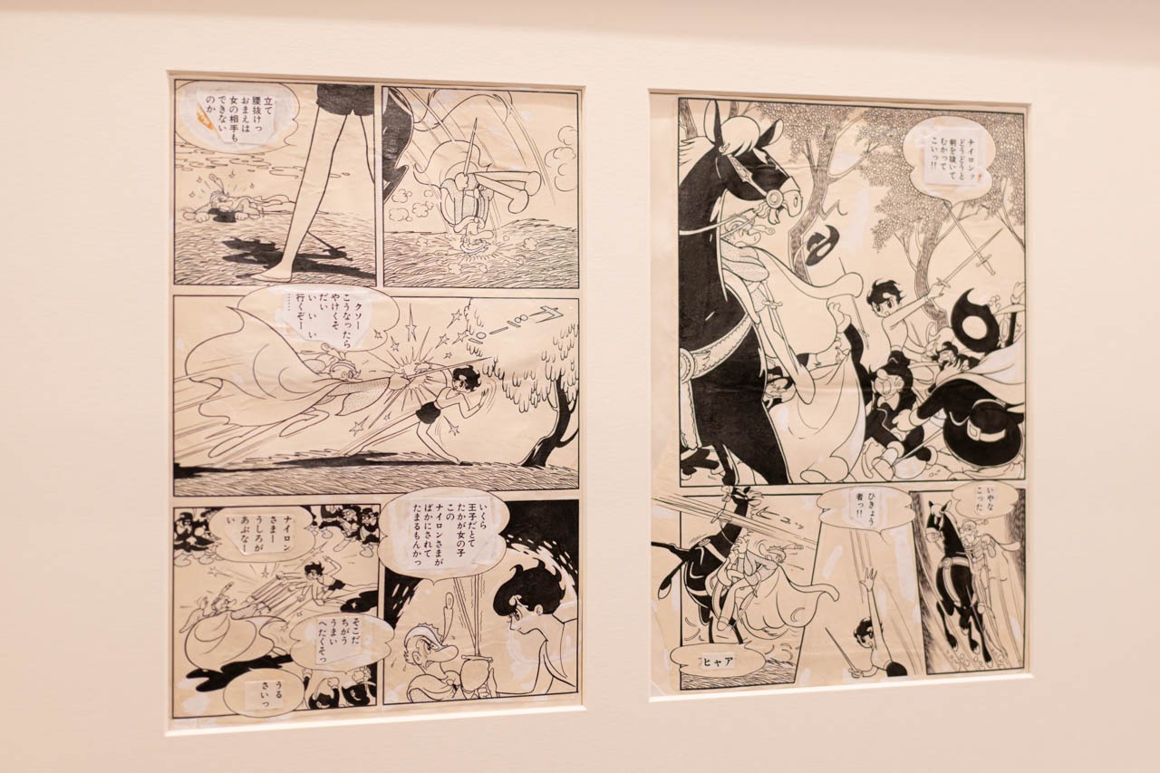 手塚治虫の登場によって、マンガはその表現領域を決定的に拡張した。展示原画からは、舞台的な画面構成が映画的な視点へと移行し、俯瞰やクローズアップ、移動する視点によって、コマが時間と運動を内包する装置へ変化していく過程が読み取れる。読者は画面の外から眺める存在ではなく、物語の内部へと導かれる。 『プリンセス・サファイア(リボンの騎士)』は、その革新が主題と直結した代表作である。性別の二重性を持つ王女という設定は、タカラヅカ歌劇に着想を得た舞台性と結びつき、少女マンガに新たな心理的深度をもたらした。改訂版原画に見られる精緻な構図と感情表現は、マンガが娯楽を超えた物語芸術として確立していく瞬間を示している。