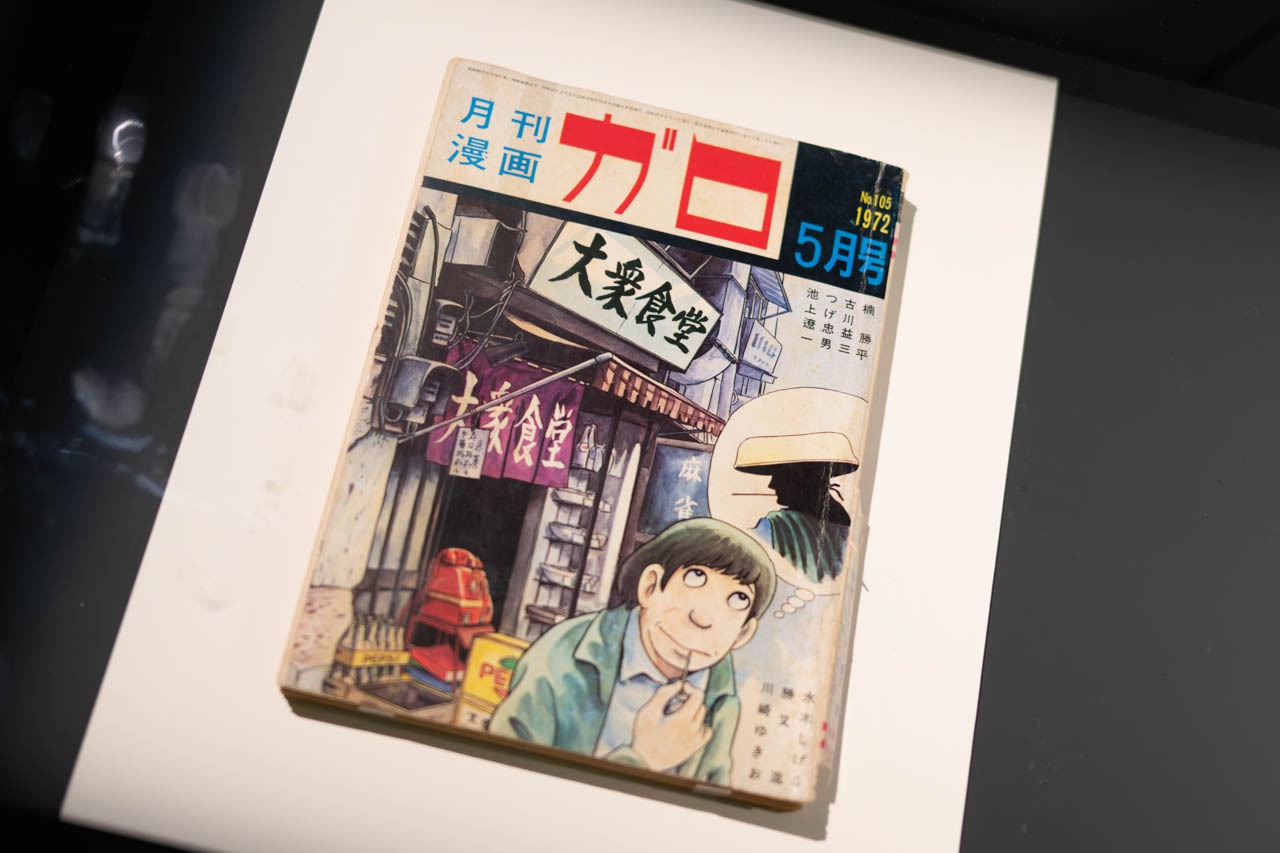 1960〜70年代のオルタナティブなマンガ文化を象徴する雑誌『月刊漫画ガロ』。展示されている1972年5月号(No.105)の表紙は、商業マンガの王道とは異なる読者層に向けて、都市の陰影や個人の孤独、戦後社会の緊張を主題として引き受けた同誌の編集方針を端的に示している。『ガロ』は劇画・アングラ系作家の重要な発表の場となり、以後のマンガ表現に「大人のための語り」を定着させた。