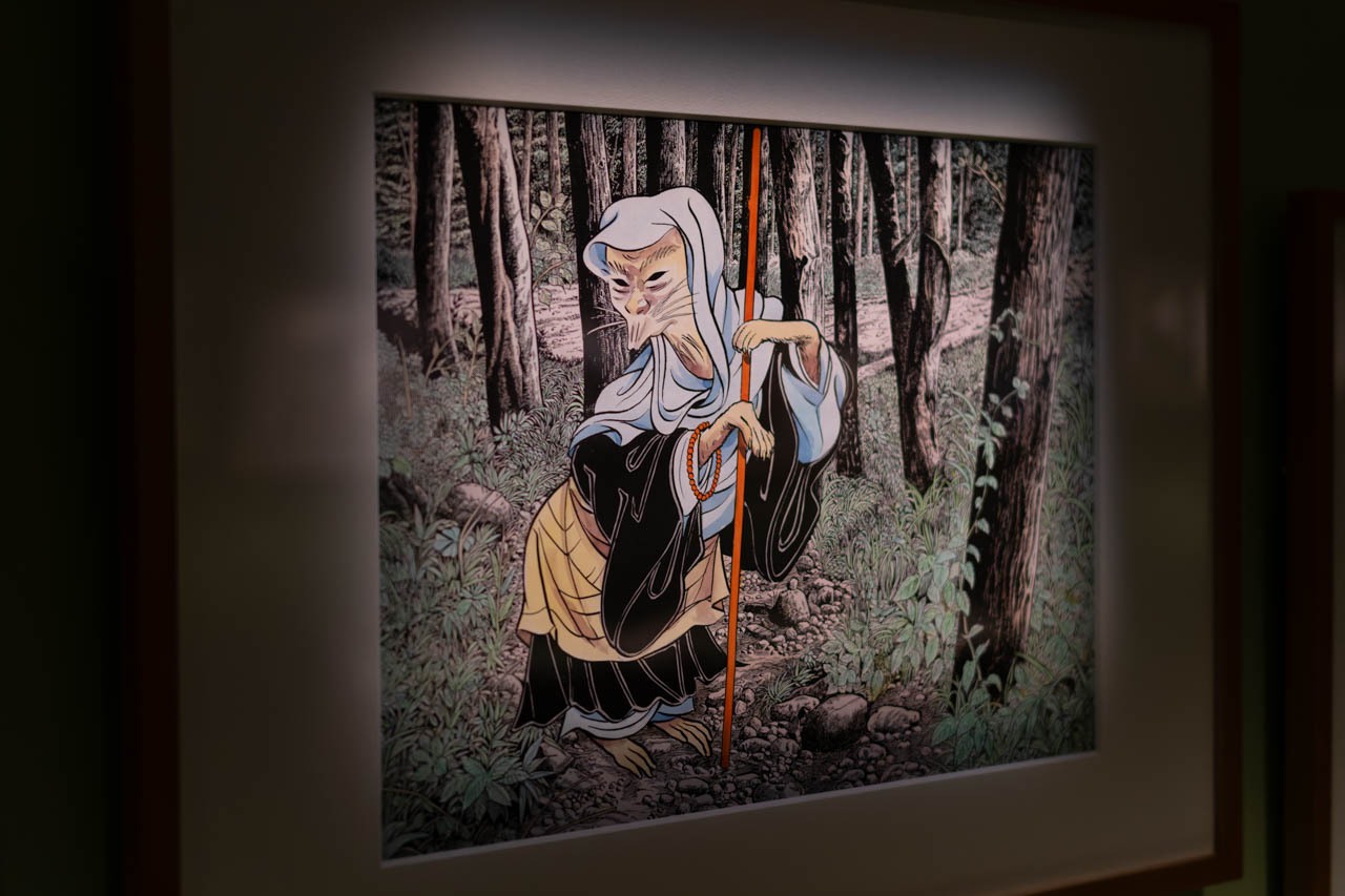 展示されている《狐僧(白蔵主)》は、狐が僧に化けて人を欺くという日本各地に伝わる民話をもとにした作品である。水木は、説話の残酷さや教訓性をそのままなぞるのではなく、妖怪の孤独や哀しみをにじませることで、物語に現代的な余韻を与えている。 細密に描かれた自然の背景と、表情豊かな妖怪の姿は、善悪の単純な二項対立を拒み、生き物としての妖怪を描き出す。ここでは妖怪は敵ではなく、人間と同じく欲望や弱さを抱えた存在として立ち現れ、水木しげるが築いた独自の倫理観が明確に示されている。