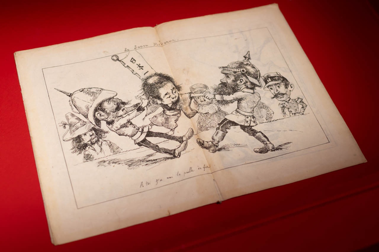 19世紀後半、日本と西洋が本格的に接触する中で生まれた風刺画や挿絵は、マンガの前史を考えるうえで欠かせない存在である。展示されているジョルジュ・フェルディナン・ビゴーによる《Tôbaé》は、日本に滞在した西洋人作家が、浮世絵や戯画の表現を取り込みながら、日本社会を観察し、描き出した作品群である。誇張された人物表現、動きの強調、ユーモアと批評性を併せ持つ画面構成は、後のマンガに通じる視覚的語法をすでに備えている。 見開き構成の中で複数の人物が連続的に配置され、場面の推移が一枚の画面に凝縮されている点も注目される。ここでは、読むことと見ることが分かちがたく結びつき、イメージが物語を駆動する。ギメ美術館が所蔵するこれらの資料は、マンガが純粋に日本内部で完結した表現ではなく、19世紀の国際的な視覚文化の往還の中で形づくられていったことを、具体的に示している。