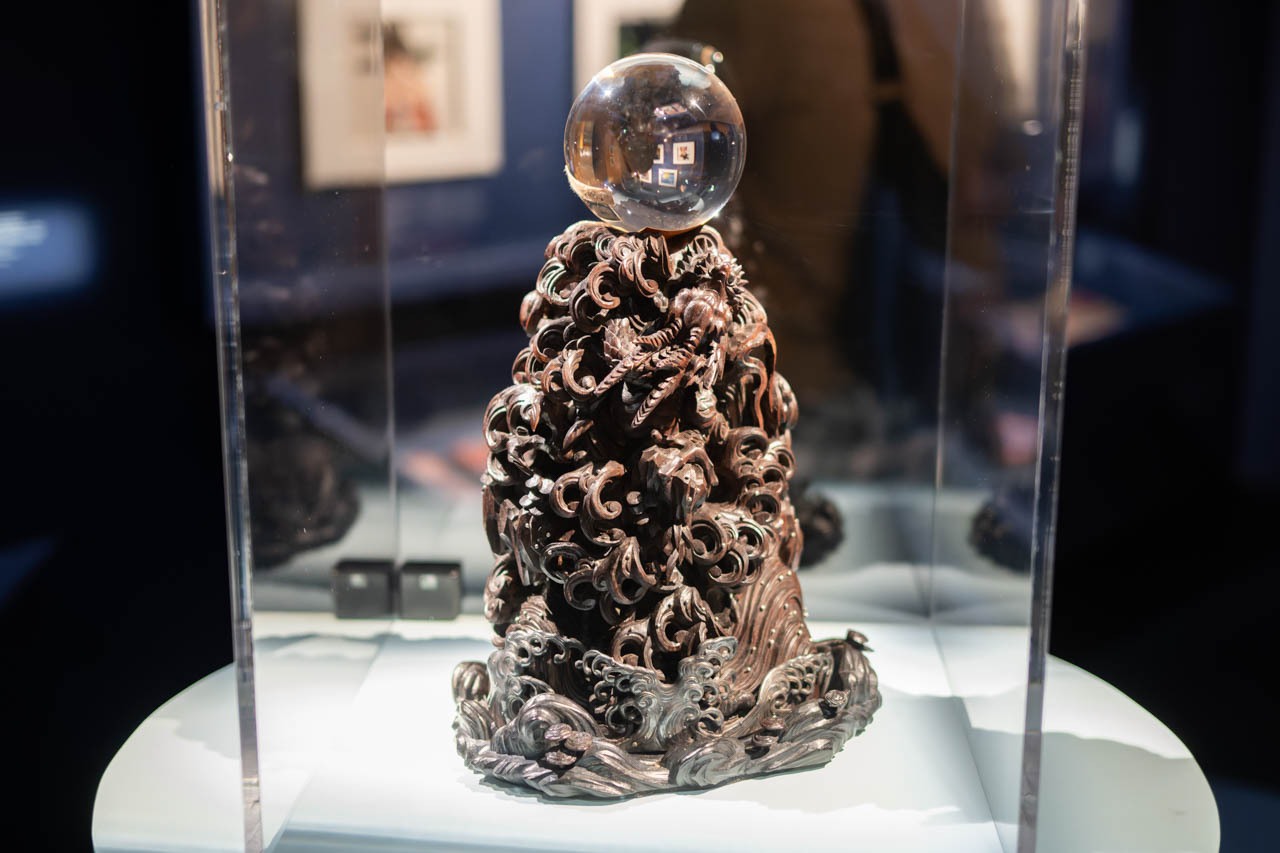 《波間の岩と如意宝珠を追う龍》は、江戸末期の装飾彫刻で、龍が智慧の珠(如意宝珠)を追う姿を、木彫と銀彩、水晶玉の組み合わせで立体化している。波間をうねる身体の動勢は、自然の力と霊性を同時に可視化する造形である。 龍と珠は、東アジアで水や天候、叡智や願望成就を象徴してきた基本モチーフであり、後世の物語表現にも繰り返し受け継がれる。本作は、信仰と装飾の領域で培われた図像が、現代のマンガ的神話へ接続していく系譜を示す結節点として機能している。