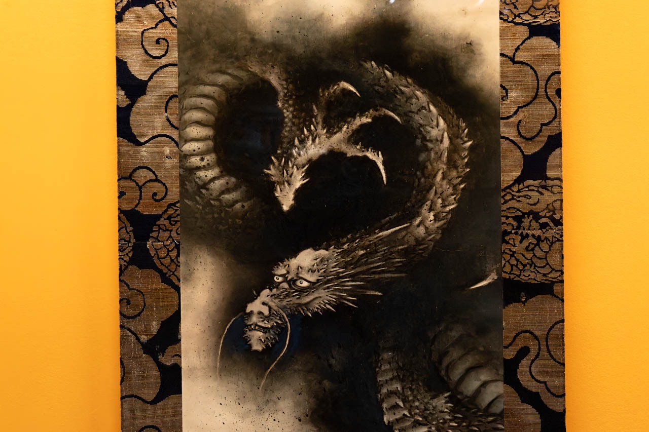 葛飾北斎《雲中龍(Dragon parmi les nuages)》は、1849年の最晩年に描かれた水墨画で、雲の中から現れては溶け込む龍の姿を、墨の滲みと余白によって捉えている。うねる胴体と鋭い眼差しは、破壊的な力ではなく、自然の循環や生成を司る存在としての龍を示す。 東アジアにおいて龍は、恵みと再生をもたらす霊獣であり、北斎は輪郭を固定せず、雲や水と同質の気配としてそれを描いた。本作は、物語以前のイメージとしての龍を結晶化させ、後世の図像や現代マンガにまで連なる想像力の原型を静かに提示している。