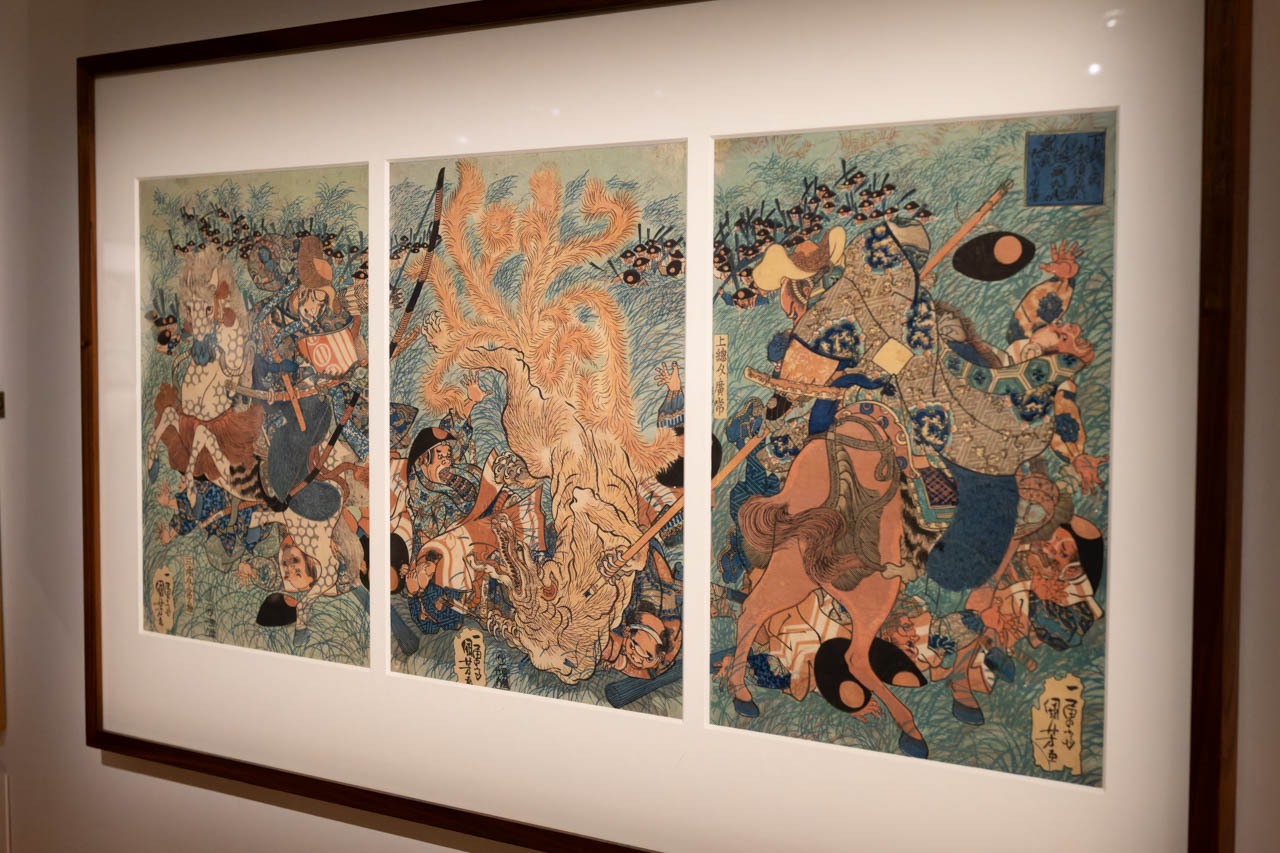 歌川国芳《常胤・広常、那須野にて九尾の狐を討つ図》(1834年)は、三枚続の錦絵で、怪異退治の場面を渦を巻く構図で描いている。画面中央の九尾の狐は自然と一体化した存在として表され、草木や水流までが妖力に呼応するかのように描き込まれる。 武者は馬上から身を乗り出し、斜めに交差する構図と密度の高い線描が、戦闘の緊張と時間の圧縮を同時に生む。九尾の狐という「変化し人を惑わす怪異」は、後のマンガやアニメの妖怪・ボス造形にも連なり、英雄譚と怪異をアクションとして視覚化する近世版画の力が、ここに凝縮されている。
