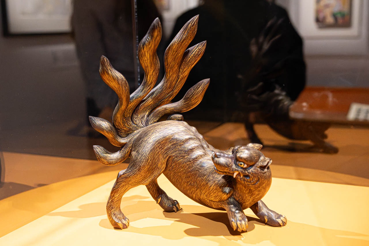 九尾の狐は、長い年月を経て妖力を得た存在として語られてきた。本作は江戸時代の木彫像で、放射状に広がる九本の尾が、妖狐の異質さと緊張感を強く際立たせている。 丸みのある胴体と踏ん張る四肢、鋭い眼差しと牙をのぞかせた口元は、理性と獣性の境界にある存在を造形として定着させる。怪異が「触れられるかたち」を得たことで、九尾の狐は絵画や版画を経て、マンガやアニメの妖狐表現へと更新され続ける視覚的原型となっている。