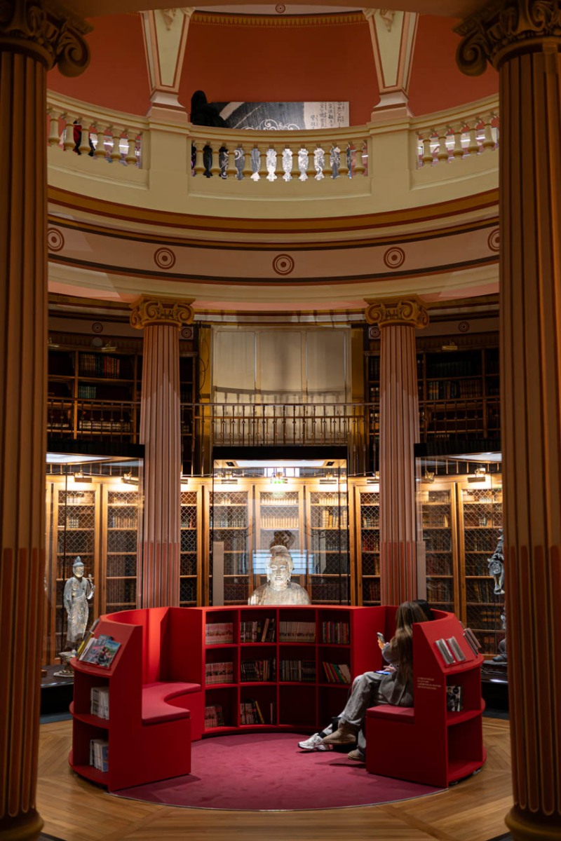 ギメ美術館の歴史的な図書室スペースは、もともとコレクターの愛書を収めた図書室として設えられており、重厚な書架と回廊、彫像が並ぶ空間構造は19世紀末〜20世紀初頭の収集家文化を今に伝える。ここに赤い円形の閲覧スペースが配され、『ギメ 漫画』展に合わせてマンガ閲覧のための場所として開放されている。 落ち着いた書架に囲まれ、訪問者が手にするのは古典や仏教美術の解説書だけではない。戦後以降のマンガ作品が並び、来館者はここで座して読み進めることができる。この空間は、マンガが視覚芸術として書物文化の一部を担っていること、そして読む行為が単なる消費ではなく静かな鑑賞行為であることを、建築的・歴史的文脈の中に位置づける役割も果たしている。 歴史的な図書室と並置されることで、マンガは単なる娯楽にとどまらず、複数の時代・文化を内包する「読む芸術」であることが実感として立ち上がる。ここから読み進める体験が、展示を訪れた者それぞれの思考を静かに広げていく。