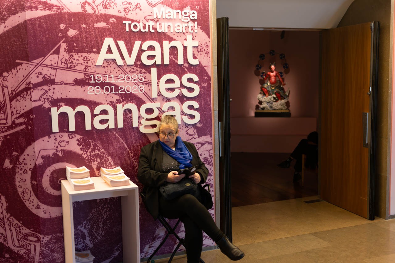 ギメ美術館の企画展は通常、地下展示室に集約されるが、本展「Manga, tout un art!」は例外的に、日本美術コレクションが常設される3階へと展示空間を拡張している。この配置は単なる動線上の工夫ではなく、マンガを日本美術史の内部に位置づけ直すための明確な意思表示でもある。 「Avant les mangas」と題された導入セクションが示すように、本展はマンガを19世紀末以降に突如出現した表現としてではなく、それ以前から存在していた日本の視覚文化の延長として捉えている。文字と図像が密接に結びついた語り、身体の動きや自然現象を誇張して描く手法、戦いや競技への嗜好、幻想的存在への関心、そしてユーモアの併存──こうした要素は、すでに近世以前の絵画や版本、浮世絵の中に確認できる。 3階に配置されたマンガ関連作品は、仏教彫刻や絵巻、版画と同じ空間で提示されることで、そうした連続性を来館者の身体感覚に訴えかける。マンガは「現代の大衆文化」として地下に隔離されるのではなく、歴史的造形物と並置されることで、線、構図、物語装置といった共通言語を共有する表現として読み替えられる。 また、江戸期の商業出版における連載形式や、安価な紙に黒一色で刷られたテキストと図像の関係は、現代のマンガ雑誌の成立とも呼応する。本展は起源を厳密に特定することを目的とせず、時代も用途も異なる作品群を「マンガ的な視線」で横断的に眺めることを促している。 地下から3階へと展示を貫く構成そのものが、マンガを単独のジャンルとしてではなく、日本文化の長い視覚的・物語的実践の中に編み戻す試みである。マンガはここで、美術館の周縁ではなく、その語りの内部に静かに組み込まれている。