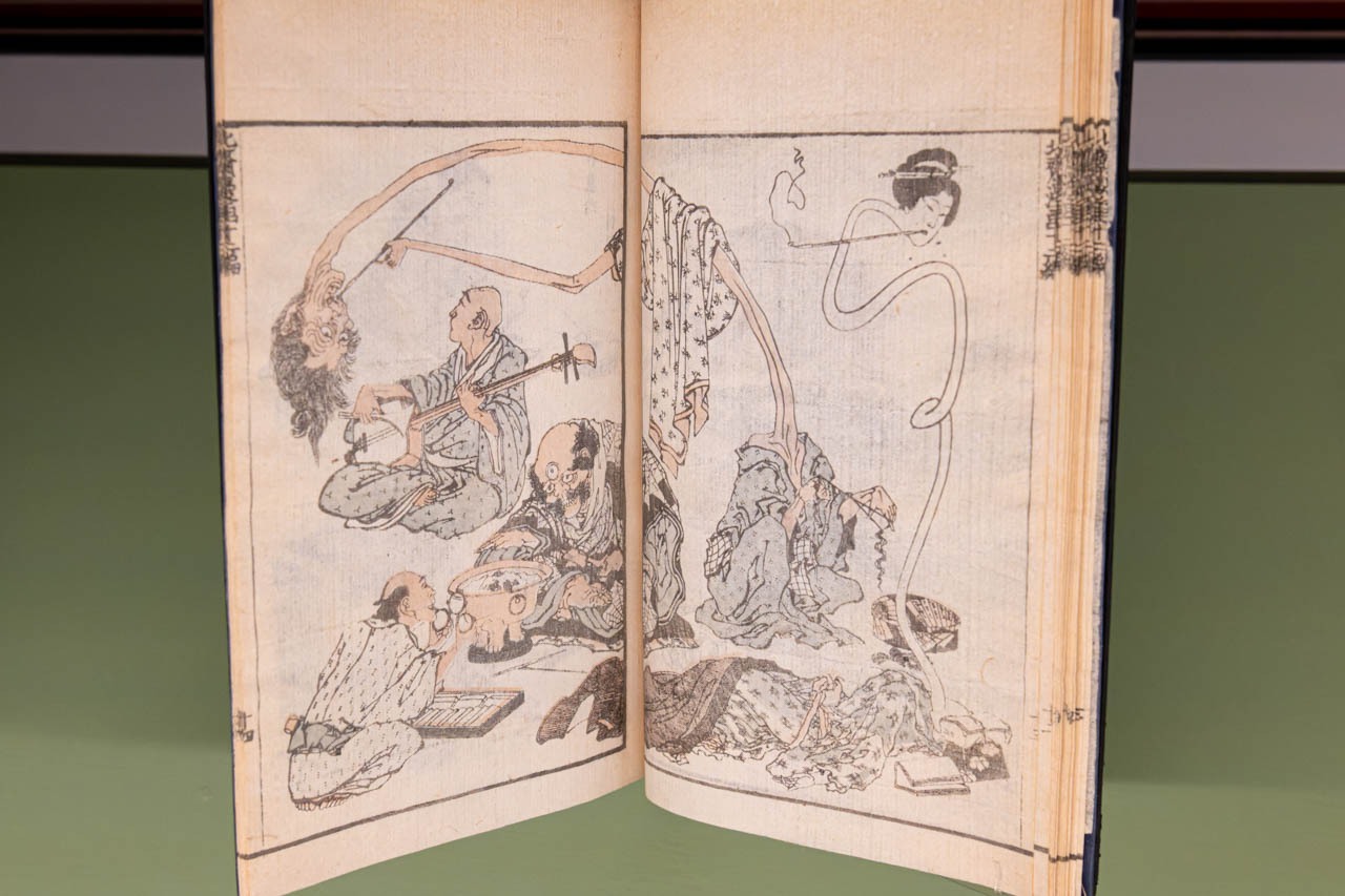 江戸後期の絵師・葛飾北斎による『北斎漫画』の一図で、室内に集う人物と異形の存在が同一空間に描かれている。三つ目の男や、異様に長く伸びる首を持つ女の姿は、怪異を恐怖としてではなく、日常の延長にある可笑しみとして捉える北斎の視線をよく示している。断片的なモチーフを並置し、動きや変形を誇張するこの描写は、後世のマンガに通じる想像力と視覚的リズムをすでに備えている。
