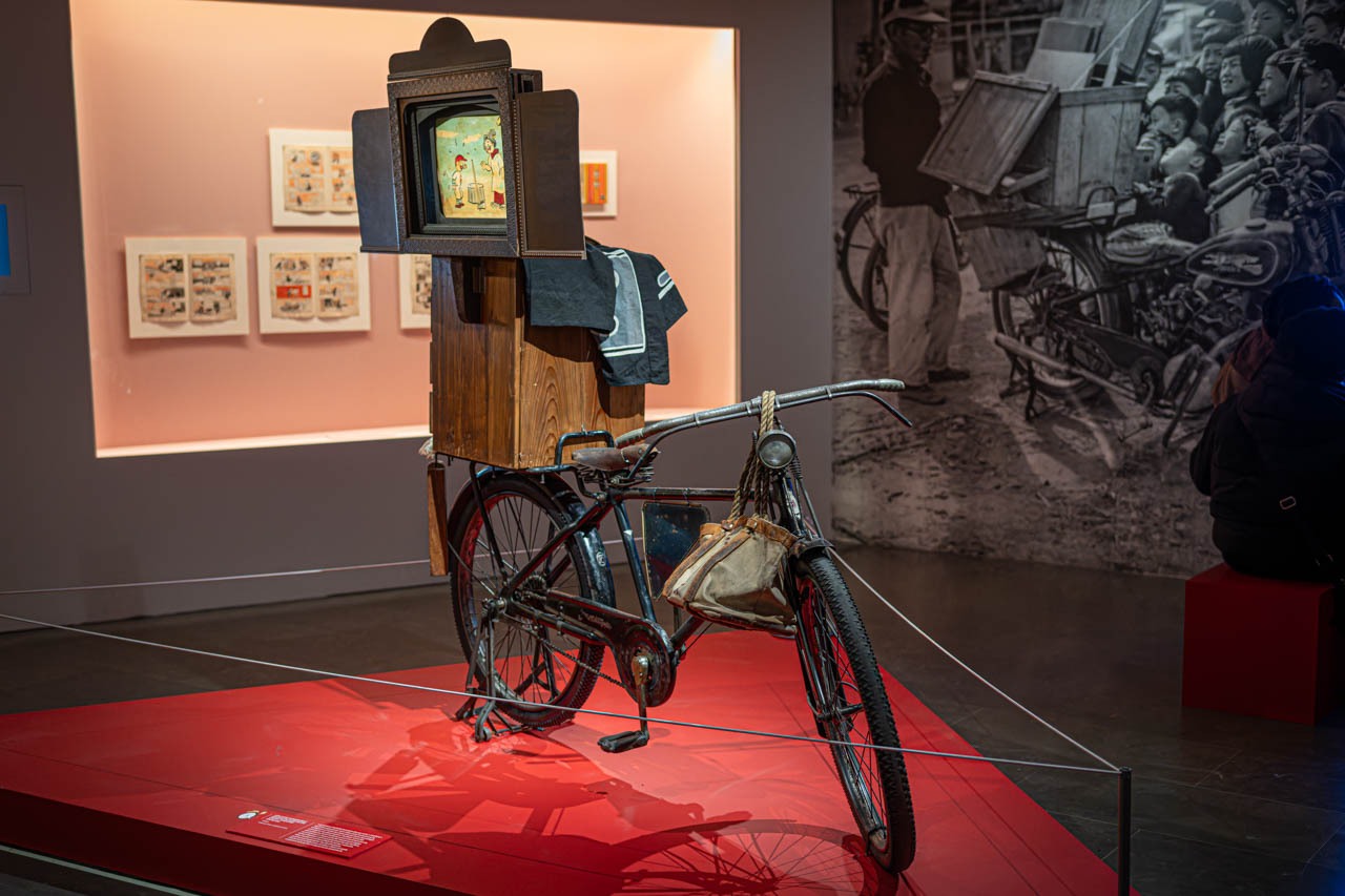 1930年代の街角で親しまれた紙芝居は、マンガの物語表現を支えた重要な視覚文化の一つである。展示されている自転車型の紙芝居舞台は、語り手が街を巡り、その場で即席の「劇場」を立ち上げるための装置だった。拍子木の音で観客を集め、木製の小さな舞台から絵を一枚ずつ引き抜きながら物語を進めていく。 紙芝居では、イメージと語り、音が一体化する。コマ割りやページをめくる行為に代わり、語り手の声色や効果音、絵を送る手の動きが物語のリズムを生む。マンガやアニメが獲得していく「連続するイメージによる物語体験」を、都市空間の中で先取りしていた表現と言える。 この装置を展示に組み込むことで、マンガが紙の上だけで成立したのではなく、声と身体を伴う総合的な視覚文化として育ってきたことが、立体的に伝わってくる。
