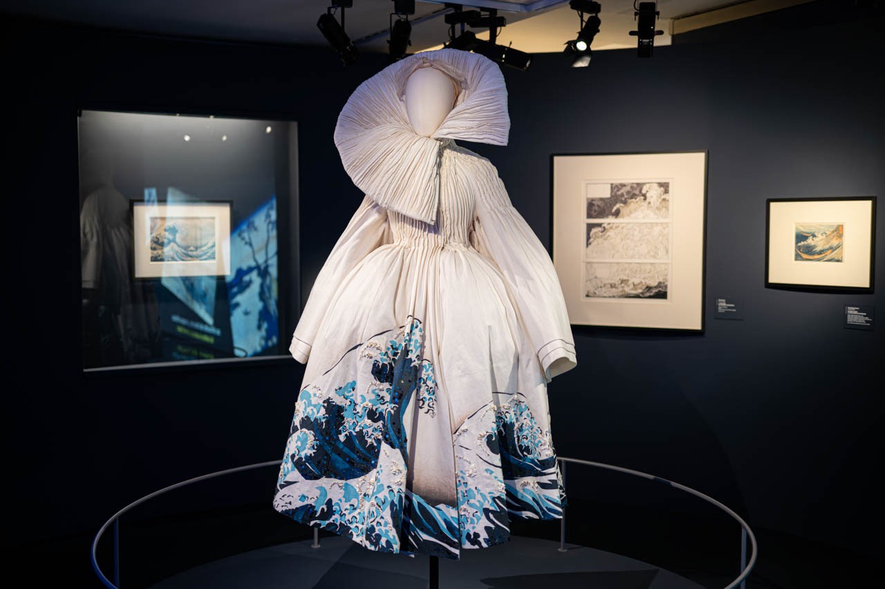 北斎の《神奈川沖浪裏》を直接的な図像として取り込みつつ、波を「モチーフ」ではなく「構造」として再構築した点が、この展示の中でも際立っている。ジョン・ガリアーノによるディオールのオートクチュール《Manteau Suzurka-san》(2007年春夏)は、裾に描かれた波が単なる装飾にとどまらず、衣服全体の量感、動勢、視線の流れを支配している。絵画としての波が、立体と身体を得て空間に現れたかのようであり、北斎の造形が19世紀の版画から21世紀のクチュールへと連続して作用し続けていることを、強い説得力をもって示している。