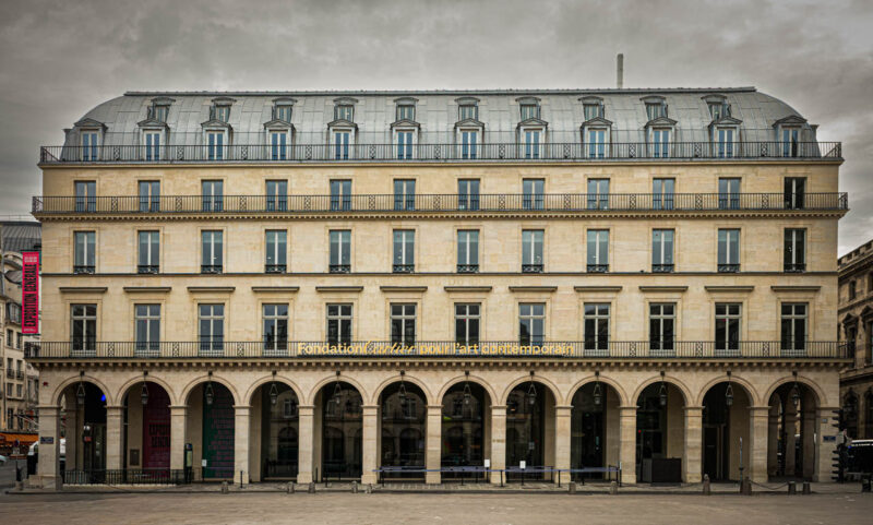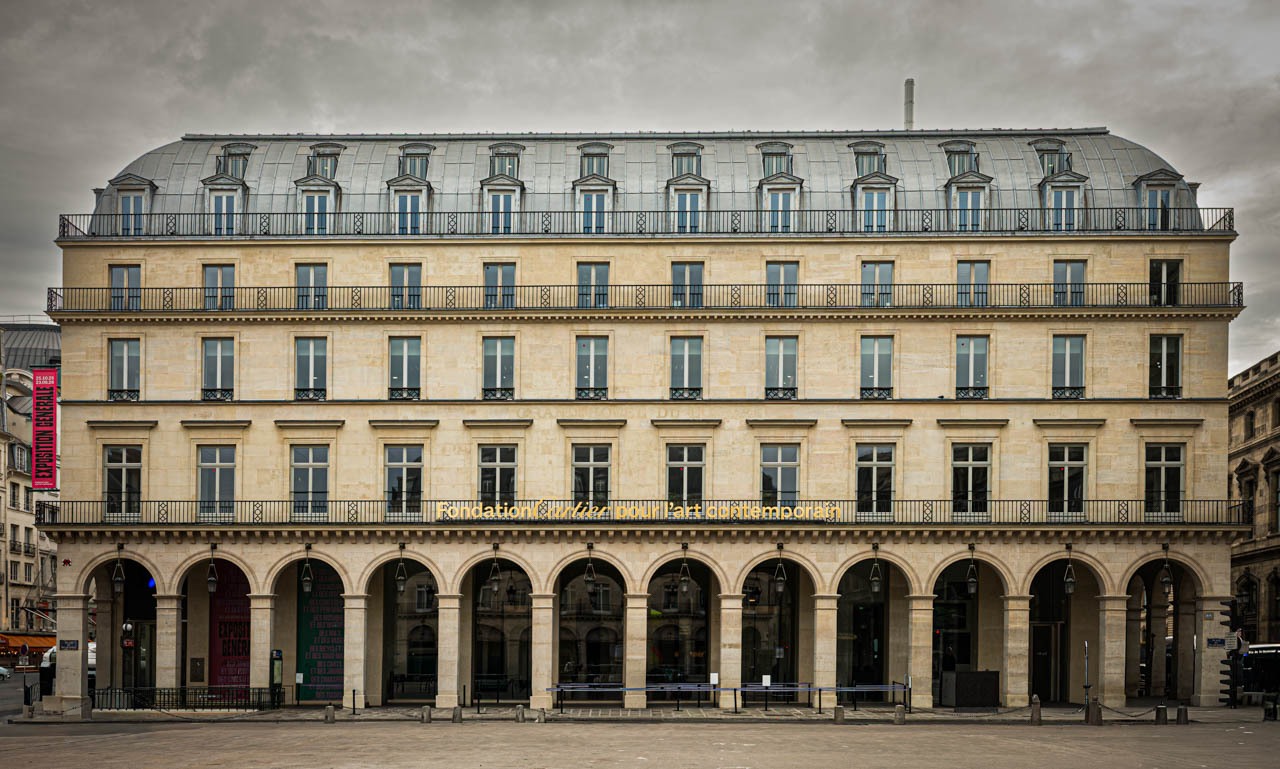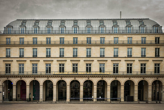 パレ・ロワイヤル広場に面した石造アーケードのファサード。ルーヴルとコメディ・フランセーズのはざま、都市の動線が交差する一等地に、オスマン期の均整を残す歴史的建物を改修して財団の新拠点としている。