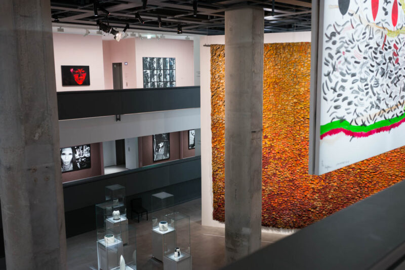 その奥のホールには、オルガ・デ・アマラル(Olga de Amaral)の黄金と赤の織壁《Muro en rojo》(1995年)がアンドレア・ブランジ(Andrea Branzi)の構造物《Gazebo》(2008年)と対峙する。織と建築、柔と剛の対話が、空間の重力を新しい均衡へと導いている。