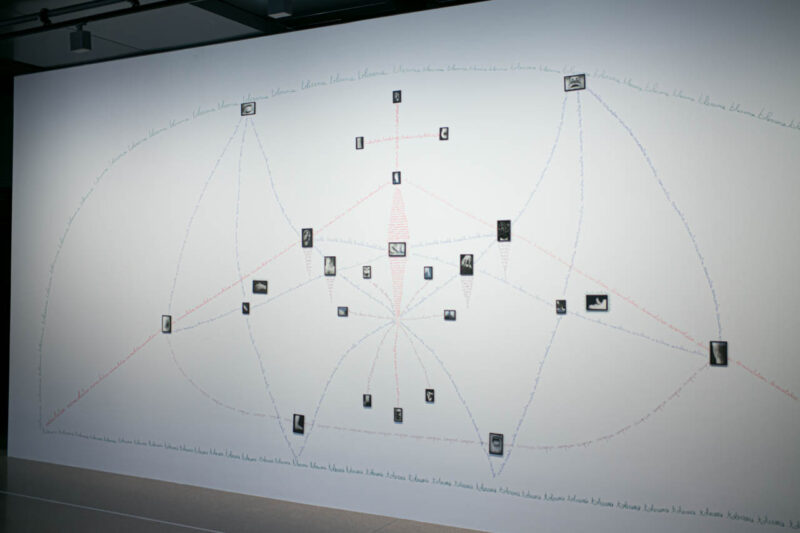 アネット・メサジェ(Annette Messager)の《Mes ouvrages》(1988年)は、手書きの言葉と小さな写真を糸のように結び、記憶と身体の断片を織り上げた地図のような作品。見る者の視線が文字を辿る行為そのものが“作品”となる。