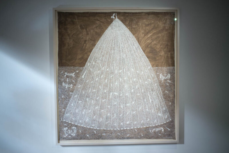ジーヴヤ・ソーマ・マシェ(Jivya Soma Mashe)は、ワルリ画の伝統をもとに《Fishnet》(2009年)を描き、人と自然の営みを点と線で構築する。
