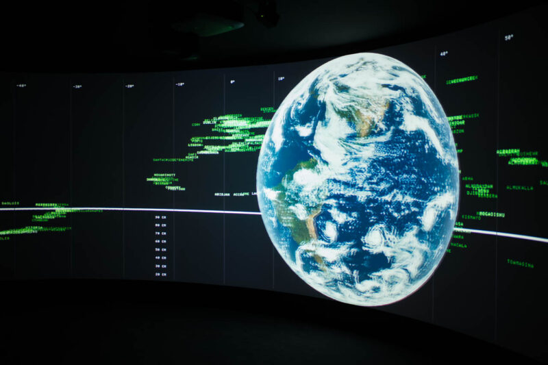 ディラー・スコフィディオ+レンフロ(Diller Scofidio + Renfro)が制作した《Exit》では、気候変動や移民、言語の変化など、地球規模のデータが音と映像によって可視化される。数字が詩に変わるその瞬間、観客は世界の“現実”を体験として受け止めることになる。