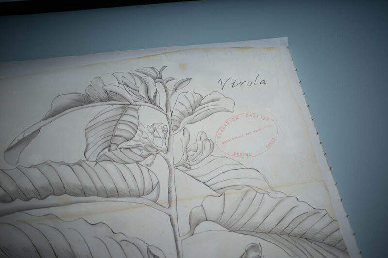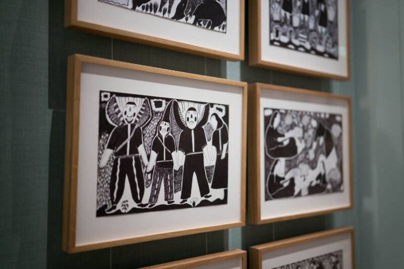 有機的なフォルムと土の質感が建築のスケールと共鳴し、生命の痕跡と大地の記憶を空間全体に満たしている。周囲の壁面には、パラグアイのグラン・チャコ地域に暮らすニバクレ族とグアラニ族によるドローイング群《Artistes du Gran Chaco》。黒一色の素朴な線が、森と儀式、日常の記憶を繊細に描き出す。