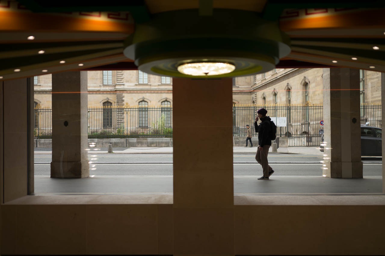 建物の奥行きと街路のあいだにあるフレーム状の開口。パレ・ロワイヤルの石柱越しにルーヴルの外壁を望む構図は、歩行者や光を取り込みながら日常そのものを展示の一部に変える。建築と都市が溶け合う瞬間が、再開したカルティエ財団の新空間を象徴している。