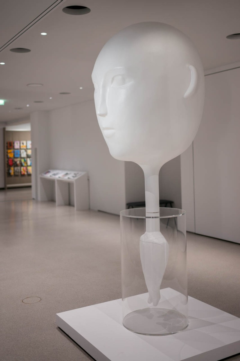 巨大化した頭部と極端に縮められた身体をもつ人型の彫刻。滑らかな白い曲面が幼児的なシルエットの異様さを覆い隠し、筒状のアクリルが身体を隔離する。アラン・セシャス(Alain Séchas)《La Grosse Tête》1986年。ポリエステル、彩色ガラス繊維、アクリルガラス。1990年収蔵。