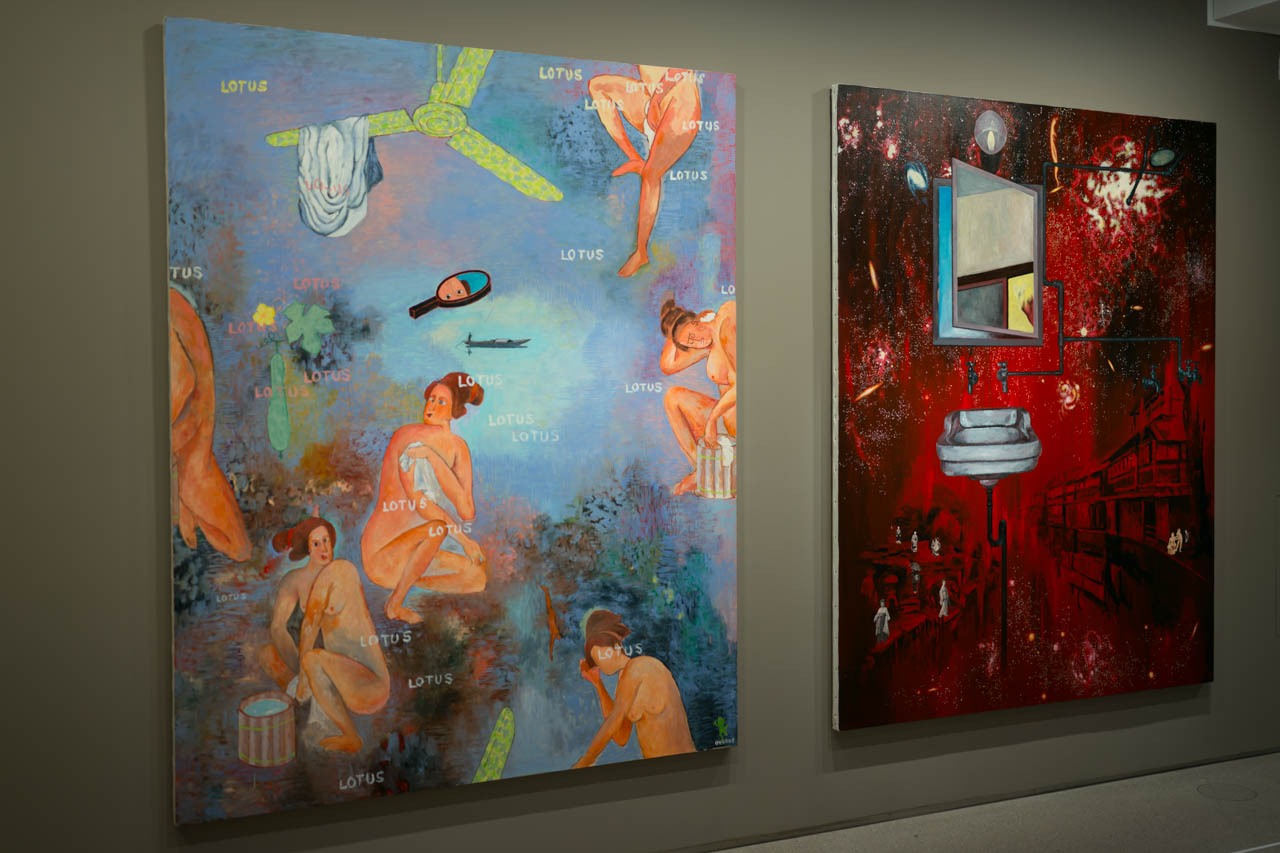 戦後日本のアヴァンギャルドを牽引した美術家・横尾忠則の絵画2点。左は《The Spa Lotus(Geisha’s Mirror)》(2004年)、浮世絵的モチーフとポップな図像を重ね、入浴する女性像をユーモラスに描く。右は《Water Circulation》(1999年)、赤い画面に配管や洗面器が浮かび、現実の断片をシュルレアリスム的に再構成している。