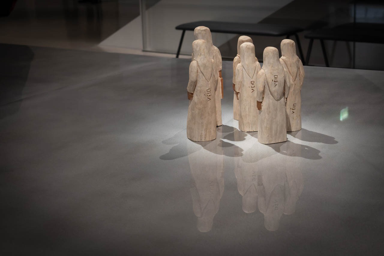 ヴェイオ(Véio/シセロ・アルヴェス・ドス・サントス)《Grupo de penitentes(苦行者たちの群れ)》1989。拾い集めた木の自然な形を生かして彫られた群像。ブラジル北東部セルタォン地方の苦行の儀式を想起させ、信仰と連帯、自然との共存を静かに語る。木肌に刻まれた祈りの姿は、この地の文化と神話を映す記憶の断片でもある。