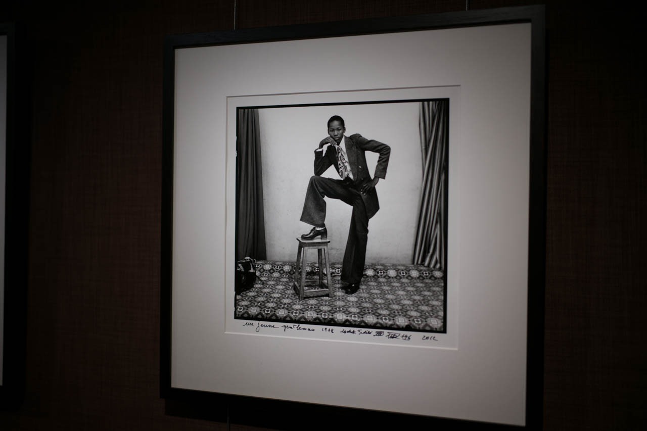 マリ出身の写真家マリク・シディベによる《Un jeune gentleman(若き紳士)》(1978年)。幾何学模様の床と布を背景に、若者が片足をスツールに乗せてポーズを取る。1970年代バマコの自由で洗練されたエネルギーを象徴するポートレート。